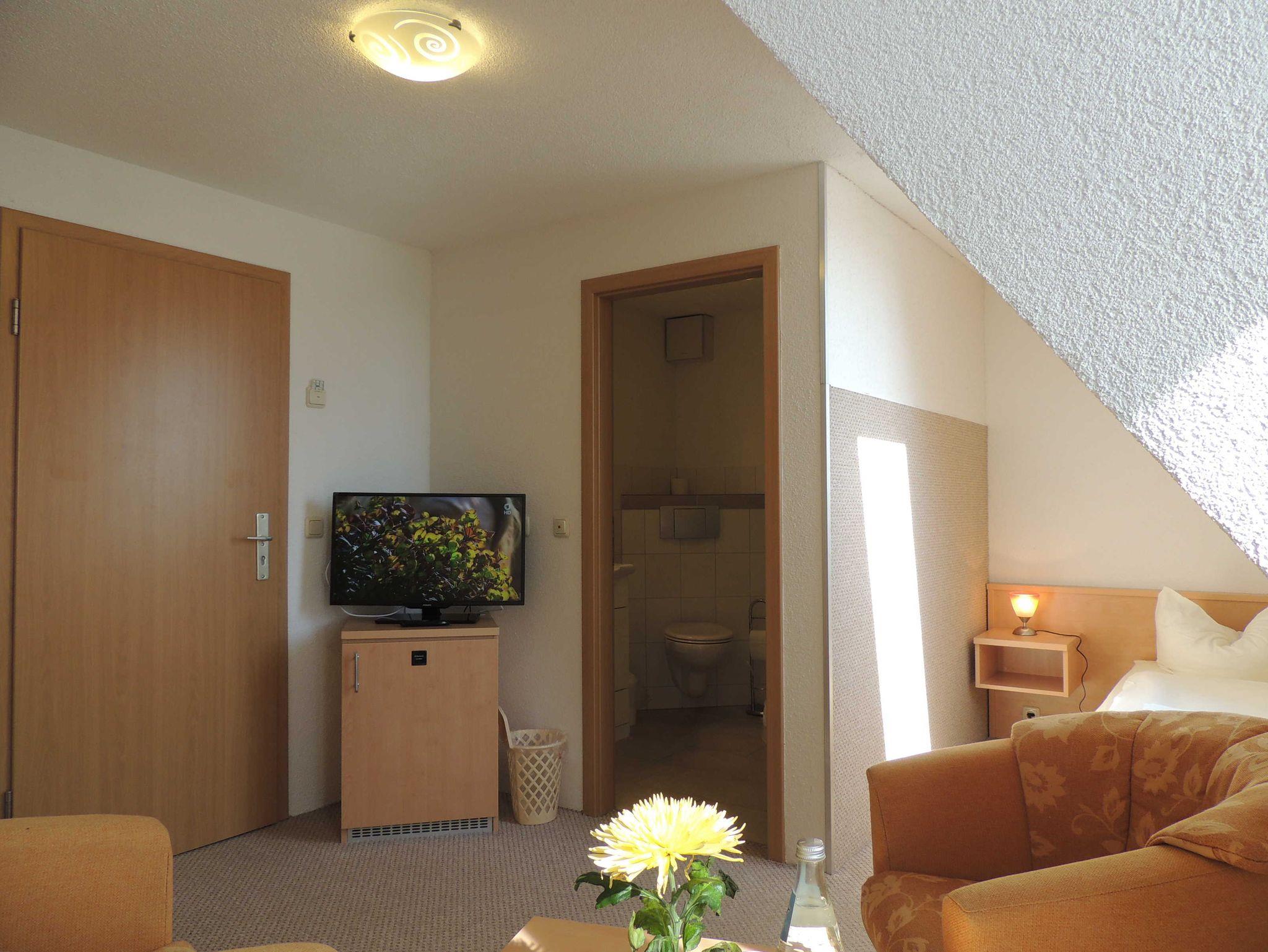 EZ mit Blick auf den Dobbertiner See ,sind ausgestattet mit Einzelbett, auch Aufbettbar mit einem 2. Bett oder Kinderbett, LCD-HDTV, Telefon, Internet, Minibar (wird auf Wunsch aufgefüllt), , Schreibtisch, DU/WC, 2 Sessel, Tisch.