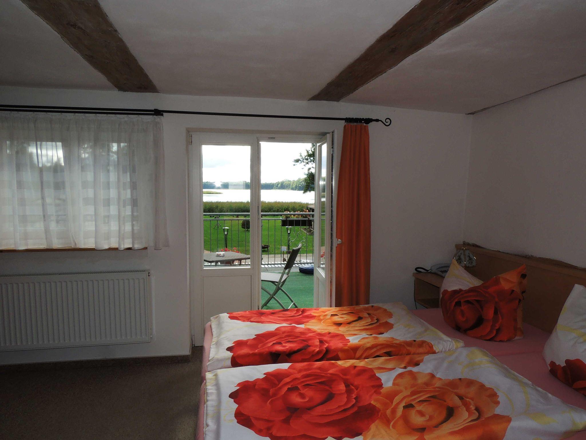DZ mit großer Dachterrasse, Blick auf den Dobbertiner See und dem historischen Park, mit Doppelbett.