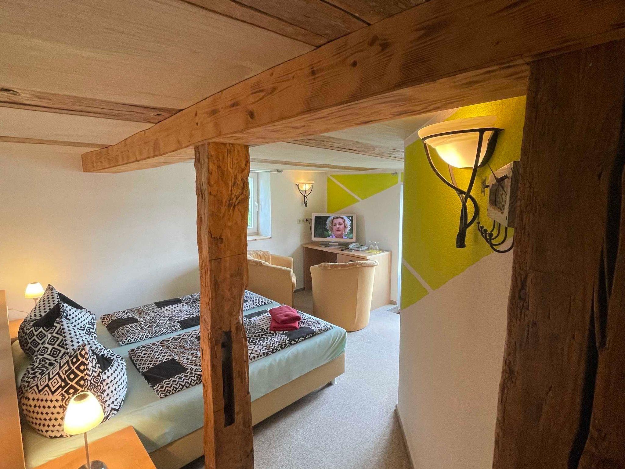 DZ mit großer Dachterrasse, Blick auf den Dobbertiner See und dem historischen Park, mit Doppelbett.