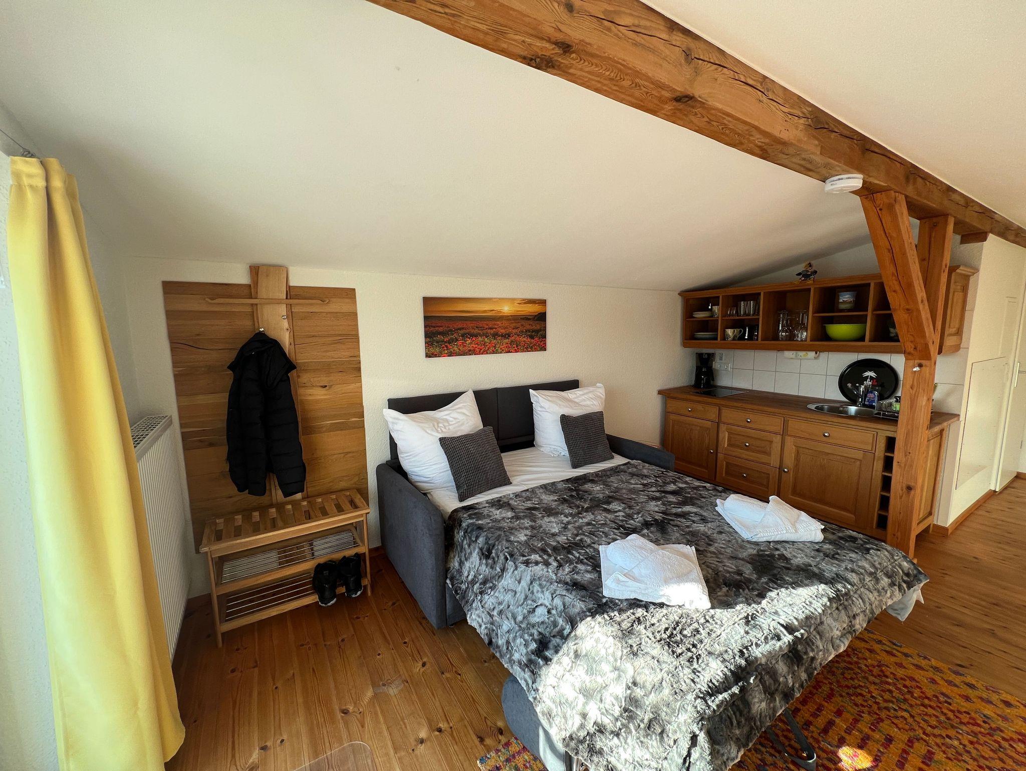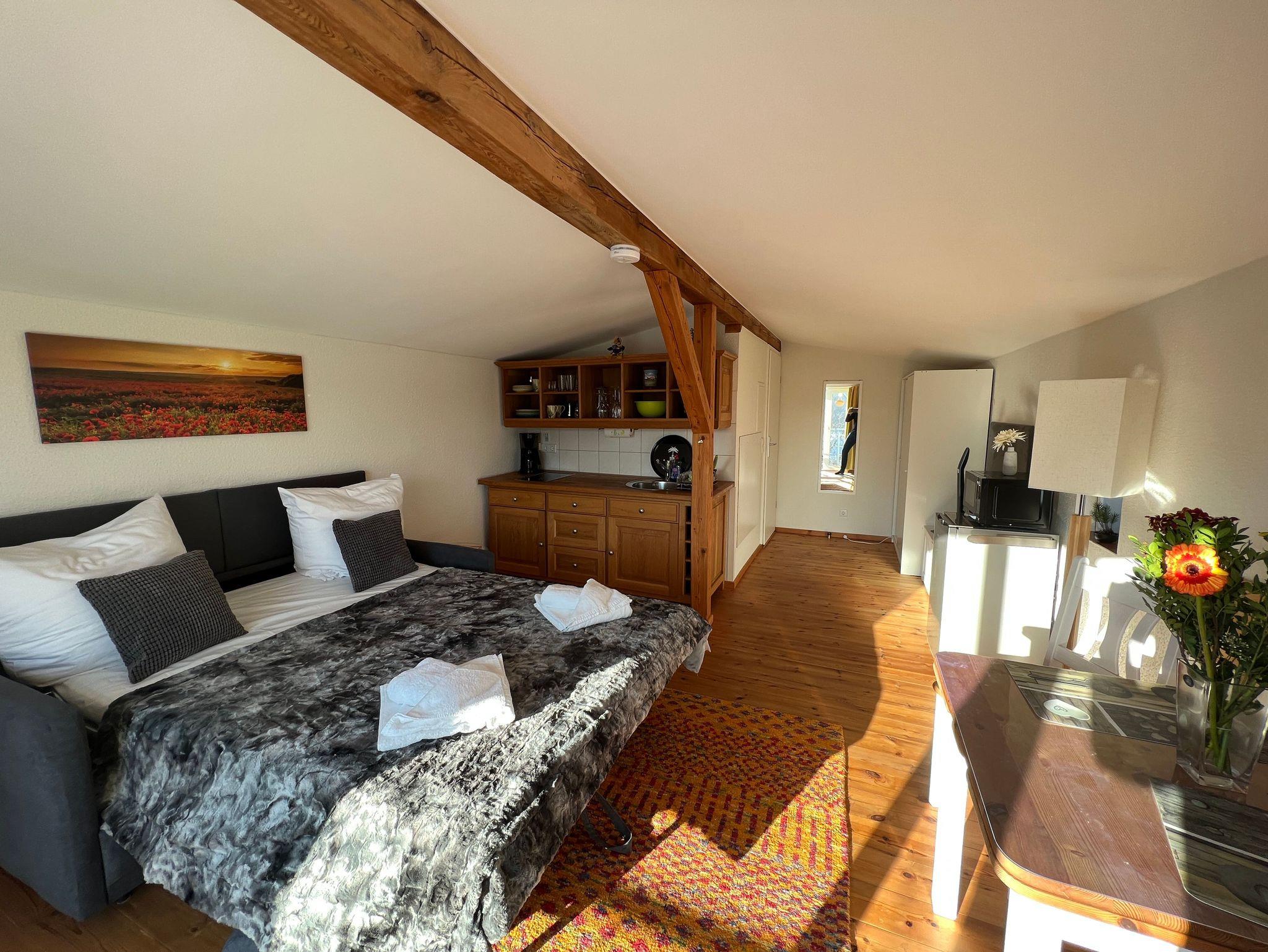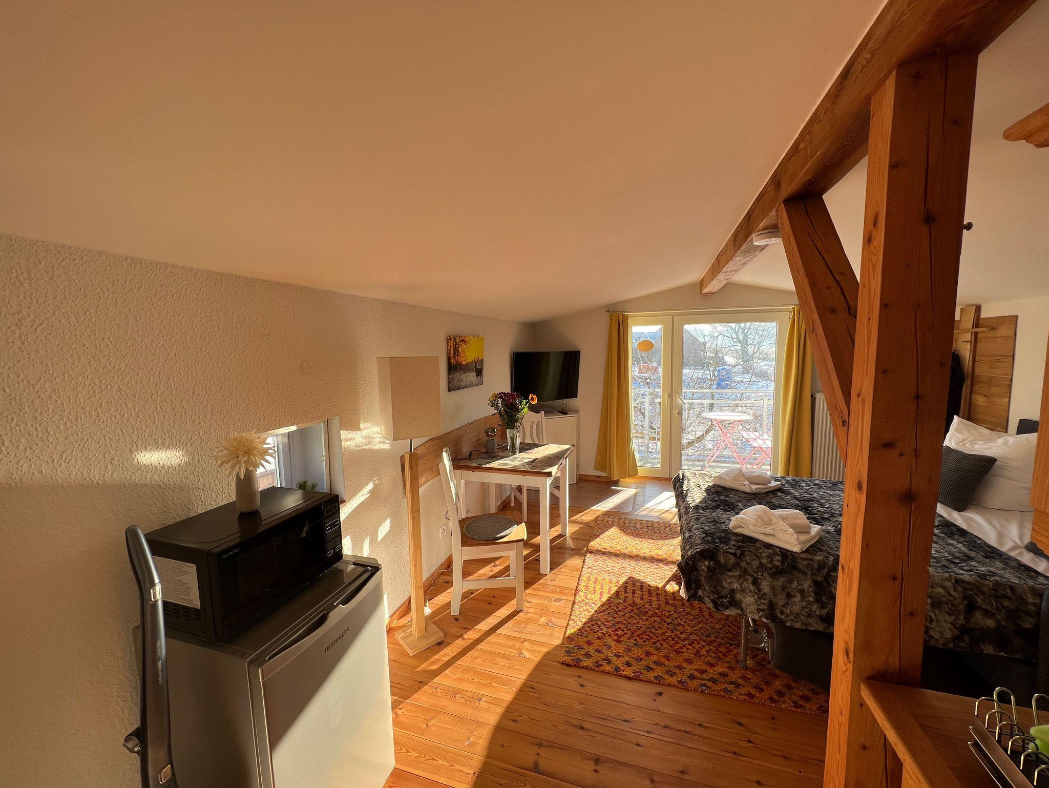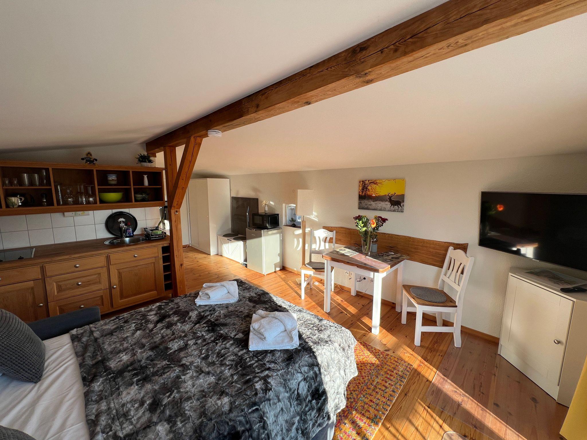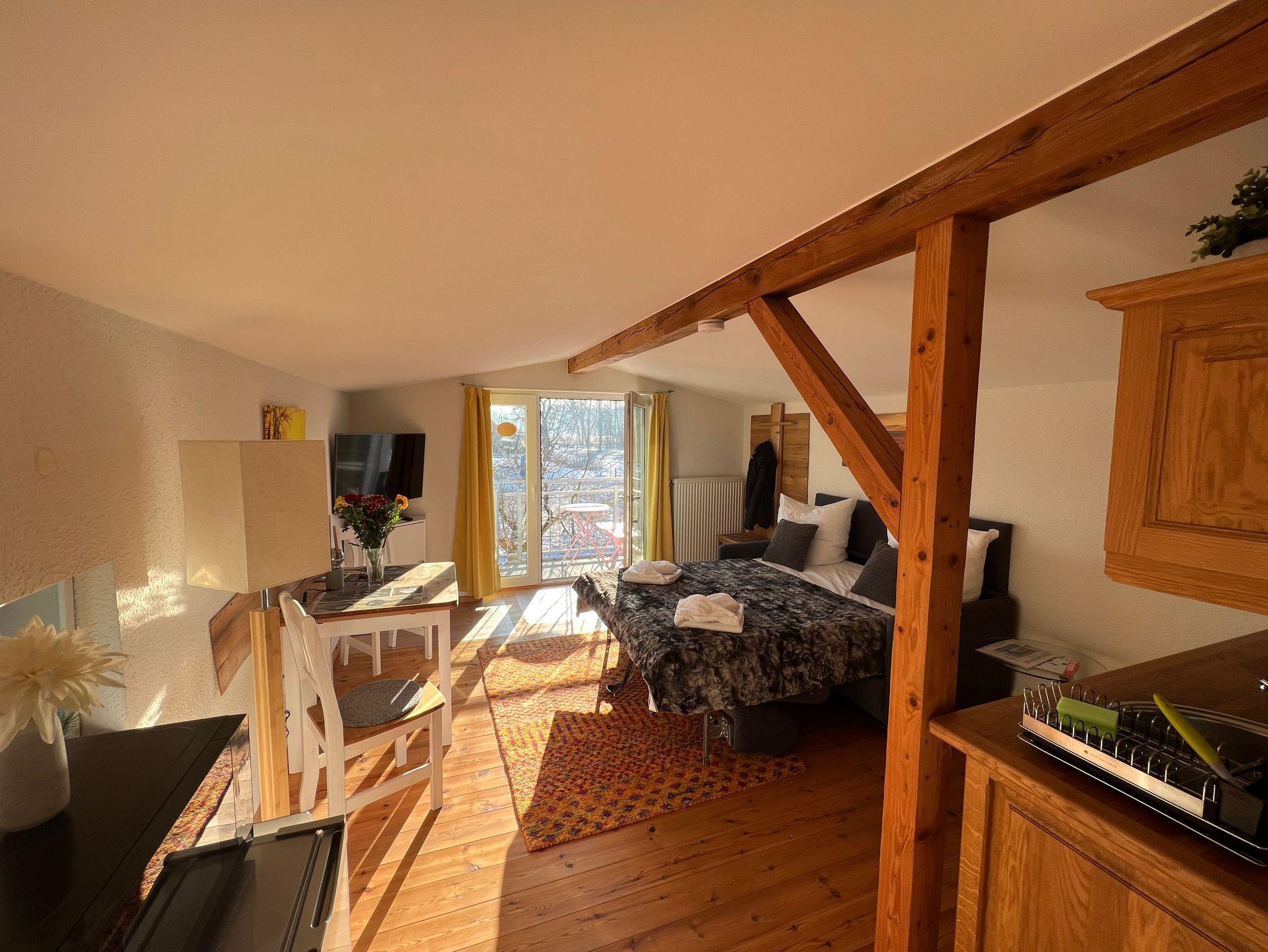 Die historische Alte Poststation beherbergt 6 individuelle, komplett sanierte Ferienwohnungen. Die Ferienwohnung Sattelkammer im charmanten Landhausstil befindet sich im Obergeschoss eines Nebengebäudes und ist über eine Außentreppe erreichbar. Die große, überdachte Terrasse des Haupthauses, kann ebenso wie der große Garten mitgenutzt werden.