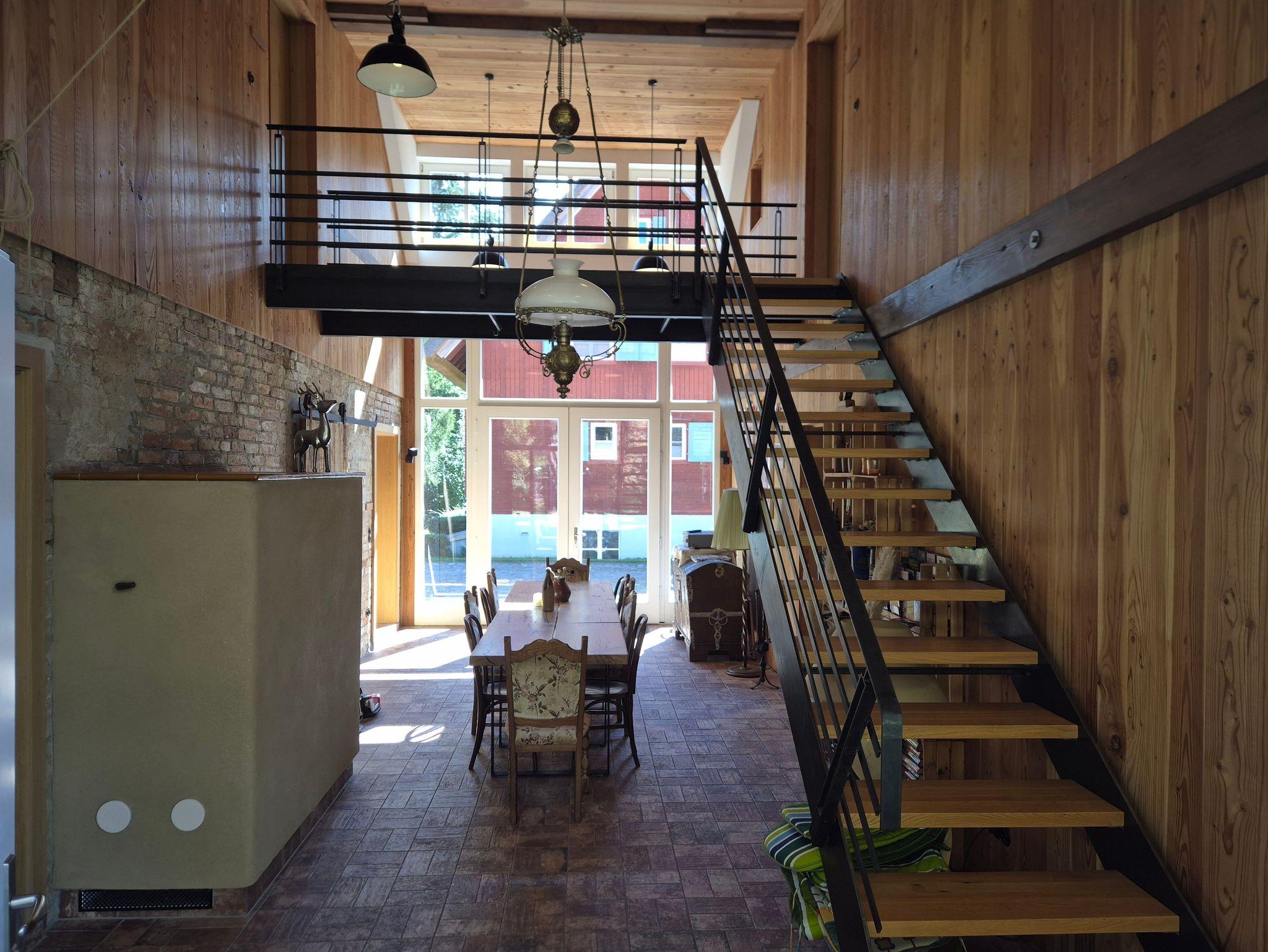 Im Eingangsbereich der Scheune befindet sich die Tenne ein gemütlicher Raum mit Heizung und Lehmgrundofen. Hier lässt es sich wunderbar gemeinsam essen, kleine Feiern ausrichten oder einfach den Abend in geselliger Runde verbringen.