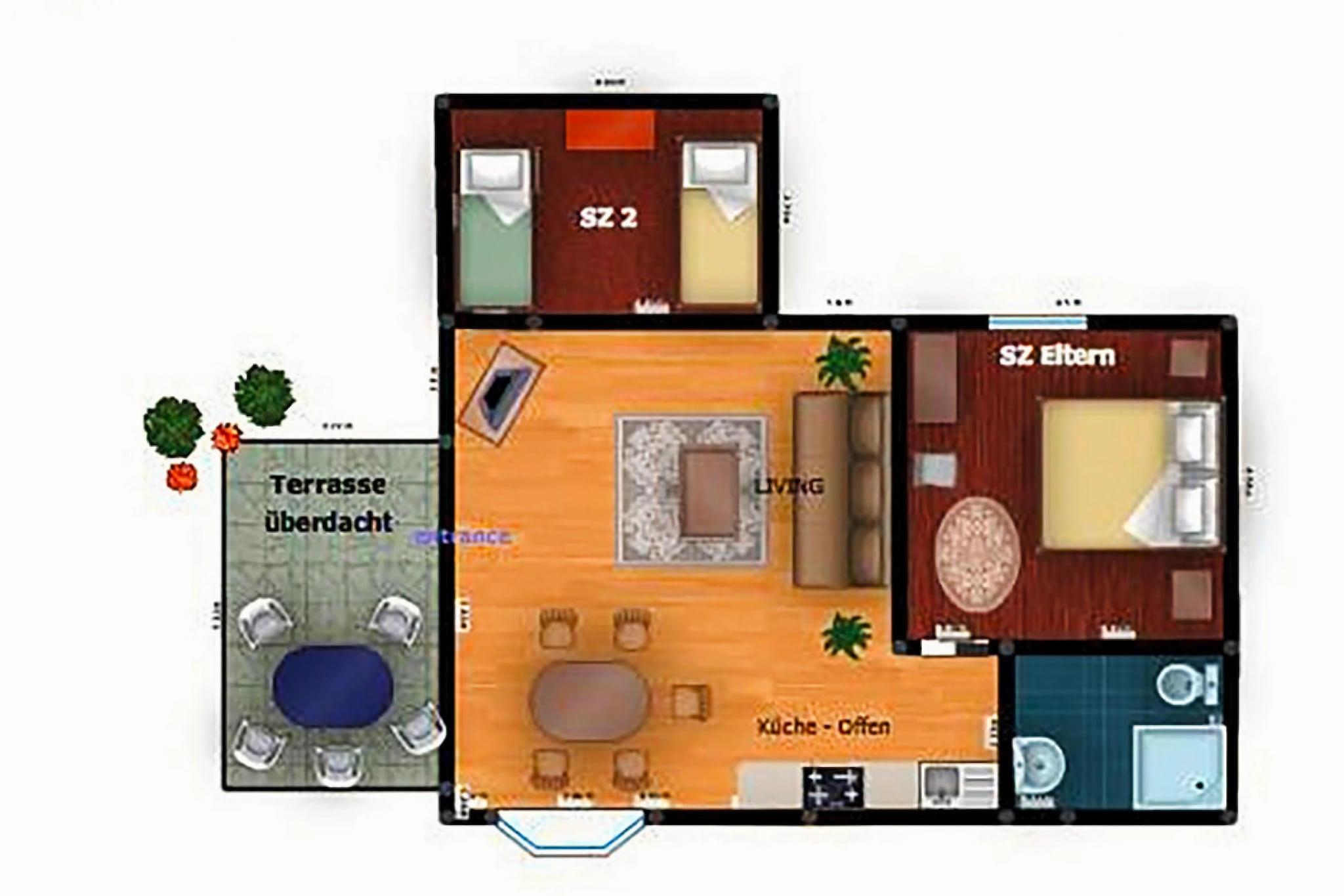 Forrådskammer(kogeplade(Komfur med to kogeplader, elektrisk), brødrister, kaffemaskine, køleskab), stue / spisestue(Fjernsyn(parabol)), soveværelse(dobbeltseng), soveværelse(enkeltseng, køjeseng), badeværelse(bruser, toilet), varme, terrasse, havemøbler, barnestol, baby crib(free)
