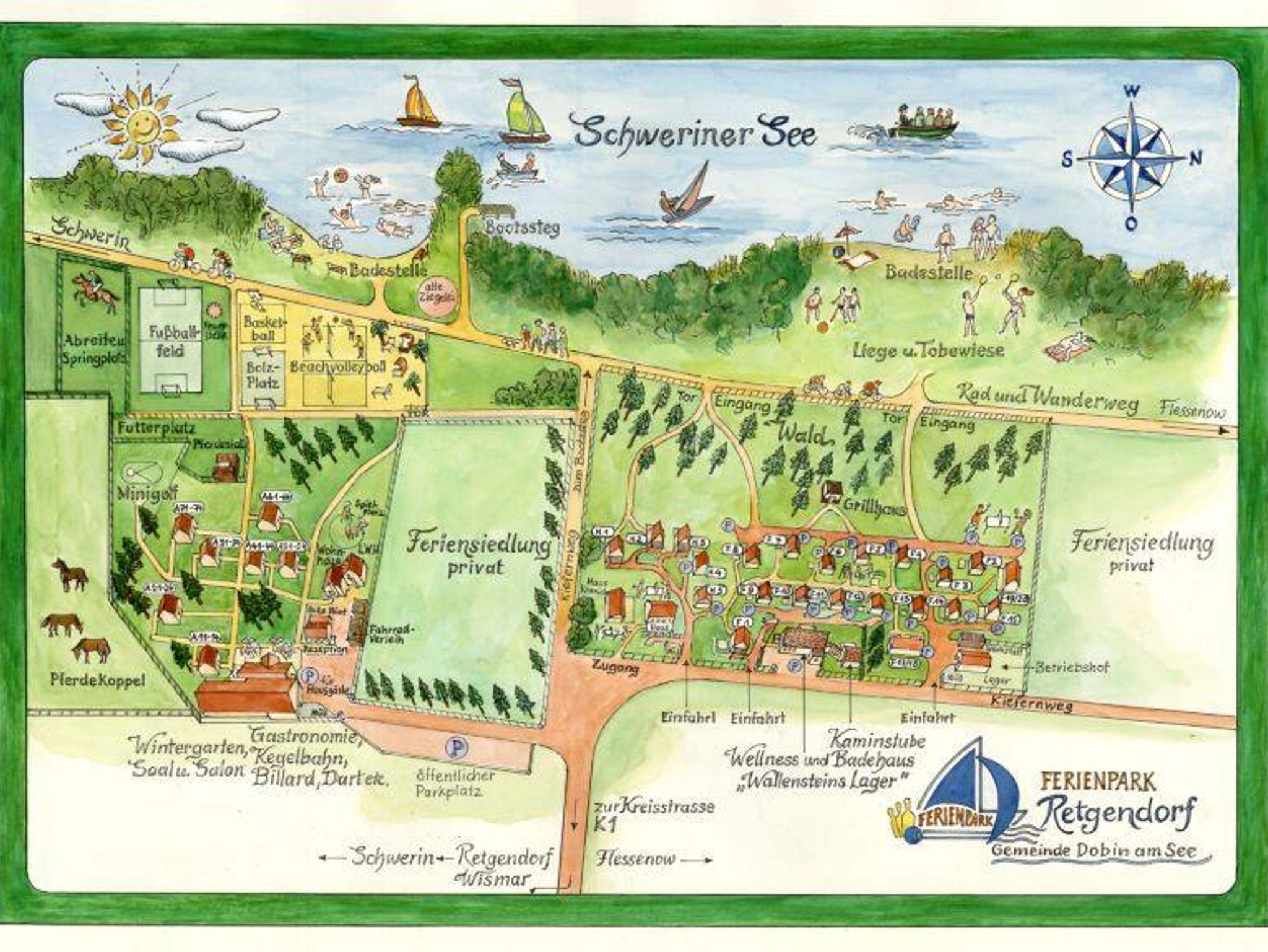 In einem lichten Kiefernwald (50 m vom Schweriner See), befindet sich auf ca. 3 ha Fläche, mit direktem Seezugang, unser familienfreundlicher Ferienpark. Je nach Personenzahl und Ausstattungsbedarf können Sie wählen zwischen über 20 modernen, gemütlich eingerichteten Doppelzimmern, über 25 Ferienhäusern (teilweise mit Carport) von komfortabler bis luxuriöser Ausstattung, DU/WC, kompletter Küche (teilw. Spülmaschinen), mit 1 - 3 Schlafzimmern,Terrasse und Gartenmöbeln. Service: Fahrräder (auch E-Bikes) und Ruderboote, Wasserski, Bundeskegelbahn, Reitpferde, Minigolf, Fußballplatz, Grillhaus, Beachvolleyball, Billard, Dart, Tischtennis, Ausflugsschiff: Natur pur und perfekte Ruhe! Unser stilvolles a la carte Restaurant mit bodenständiger Küche, Wintergarten und großer Sonnenterrasse erfüllt auch ausgefallene Wünsche. Zentrale Lage: 12 km vor Schwerin, 30 km bis zur Ostsee, 80 km bis Lübeck, Schlösser, Burgen, Grabungsstätten auf Schritt und Tritt. Ideal für Taucher, Surfer, Biker, Rad- und Fußwanderer, Segler, Naturfreunde. Gratistransfer vom und zum Bahnhof! W-Lan im Restaurant und Hotel.