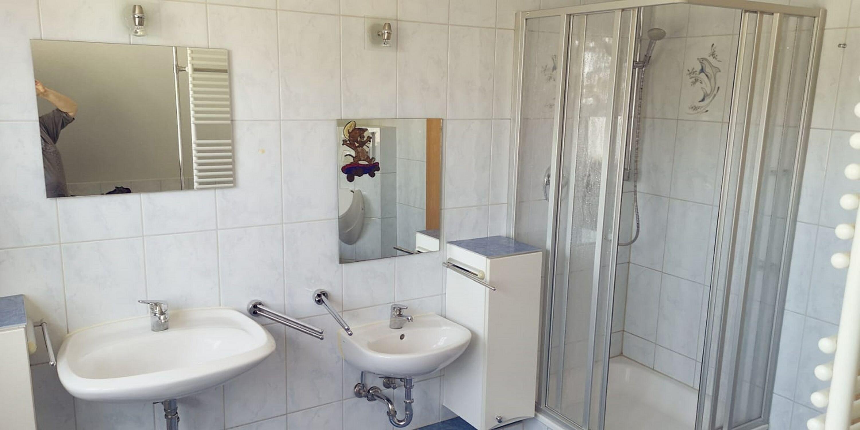 zwei Waschbecken (ein Kinderwaschbecken), Dusche, Badewanne, WC, Urinal