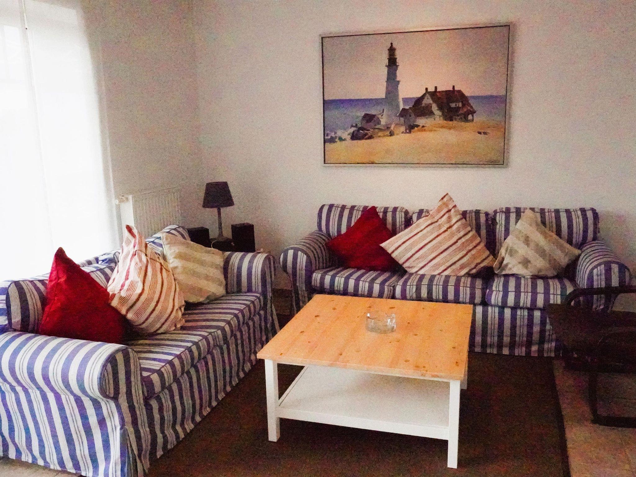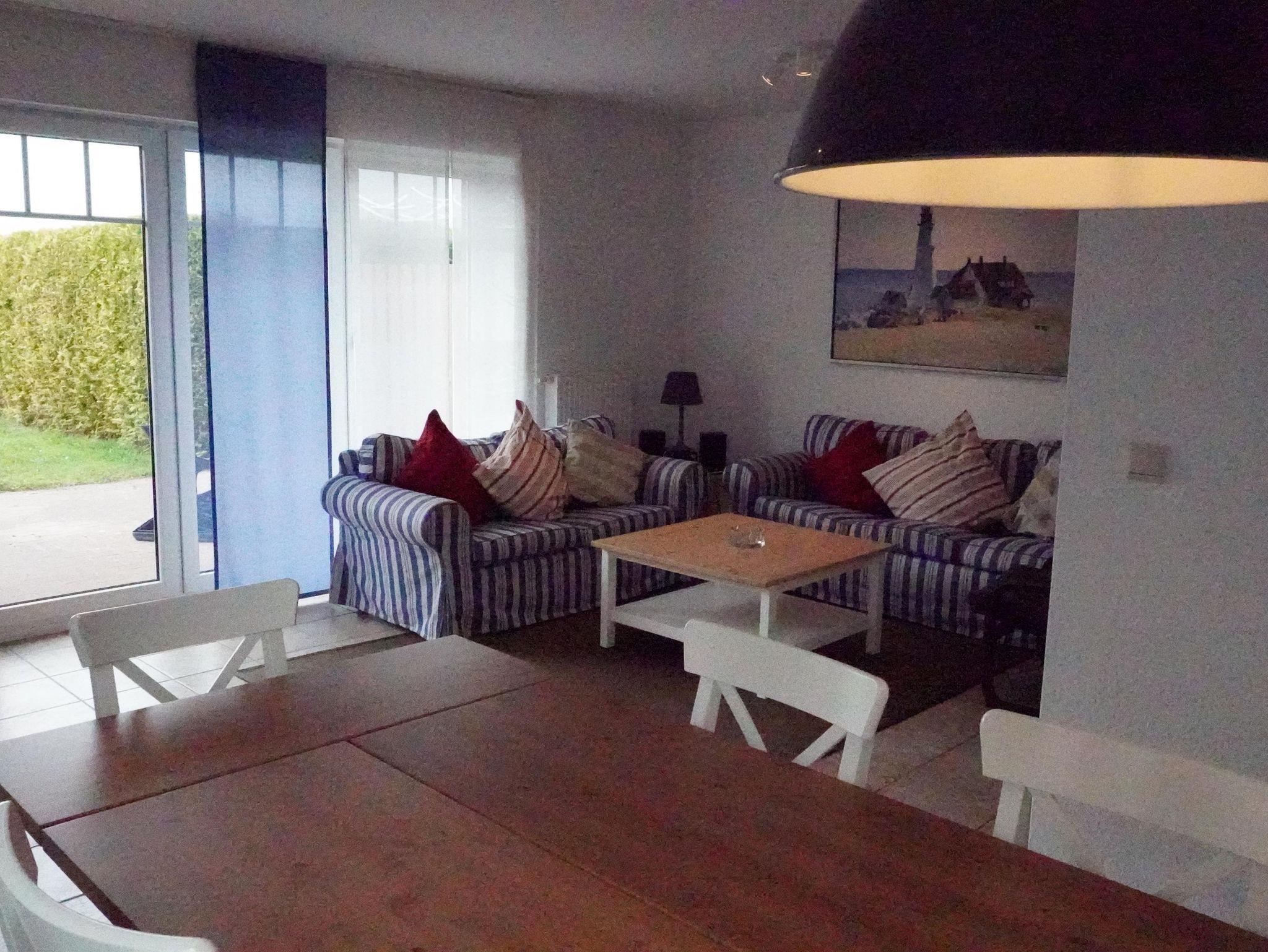 In der gemütlichen Doppelhaushälfte können Sie mit der ganzen Familie einen tollen Urlaub verbringen, da hier 6 Personen und ein Baby Platz finden. Im Erdgeschoss befinden sich ein Wohn-Essbereich, zum gemütlichen zusammen sitzen, eine separate Küche und ein Gäste WC. Im Wohnbereich mit Couch, TV, DVD-Player und einem Essbereich, befindet sich außerdem der Zugang zur Terrasse auf der Sie mit dem vorhandenen Grill schöne Abende verbringen können. Der Garten läd Ihre Kinder zum schaukeln und spielen. Über eine Wendeltreppe gelangen Sie in das erste Obergeschoss. Hier befinden sich das Badezimmer (Dusche/WC) und drei Schlafzimmer. Alle Schlafzimmer haben einen Kleiderschrank. Eines hat ein Doppelbett, das andere zwei Einzelbetten und das Dritte ein Etagenbett und ein Kinderreisebett. Für die ganz kleinen Gäste gibt es auch ein Kinderhochstuhl, Schaukelpferd und eine Kinderwippe.