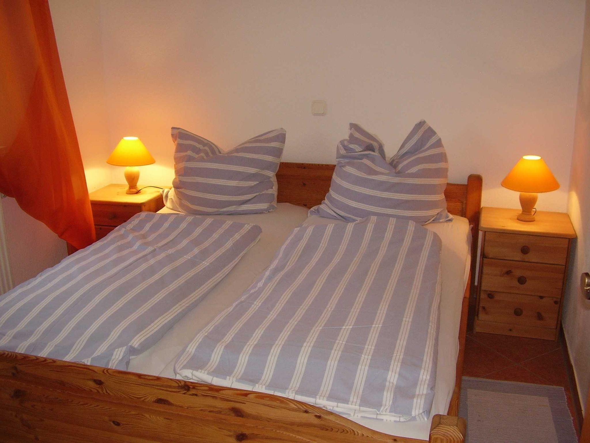 Ein Schlafzimmer mit Doppelbett. Babyreisebett steht zur Verfügung.