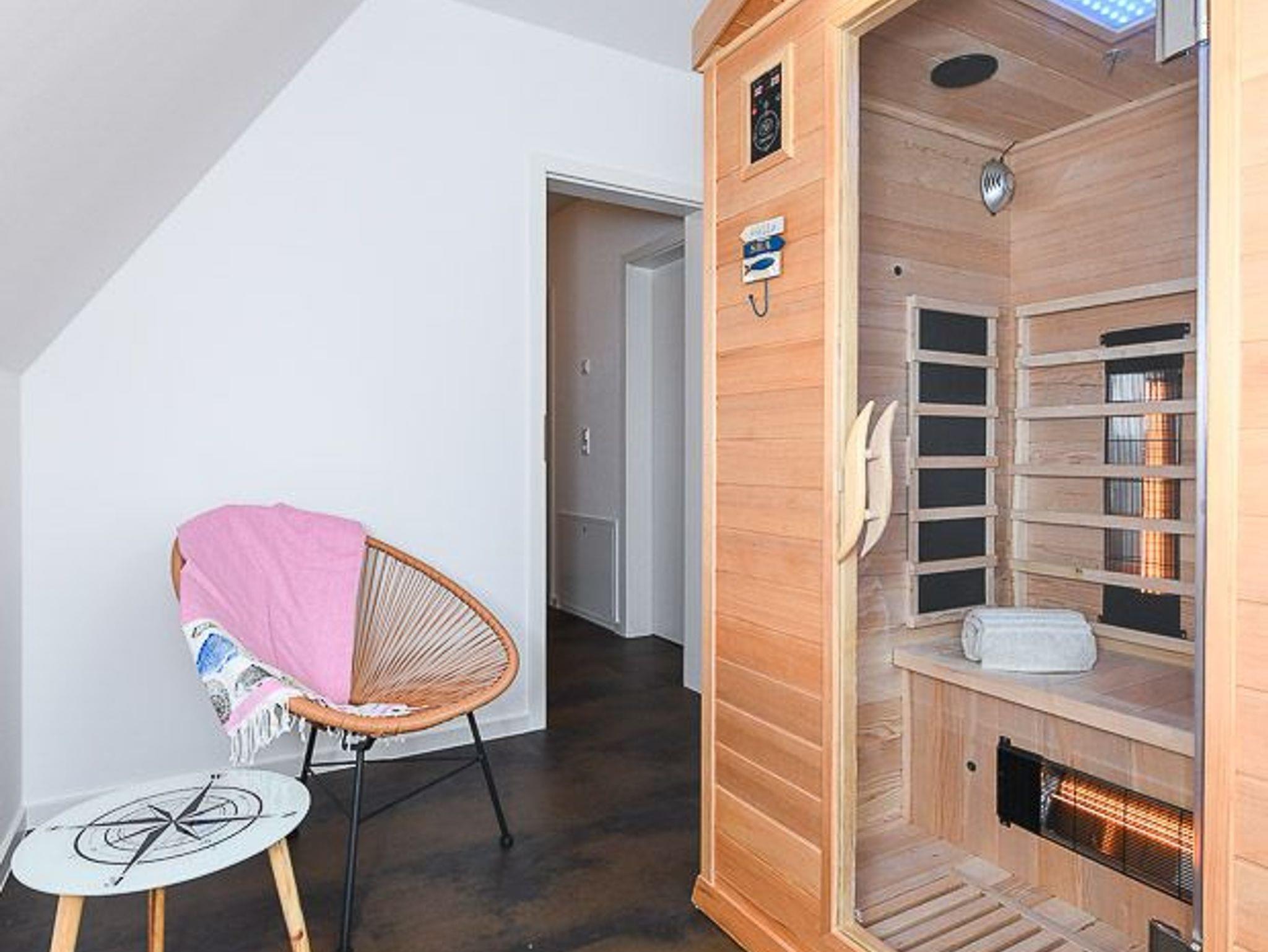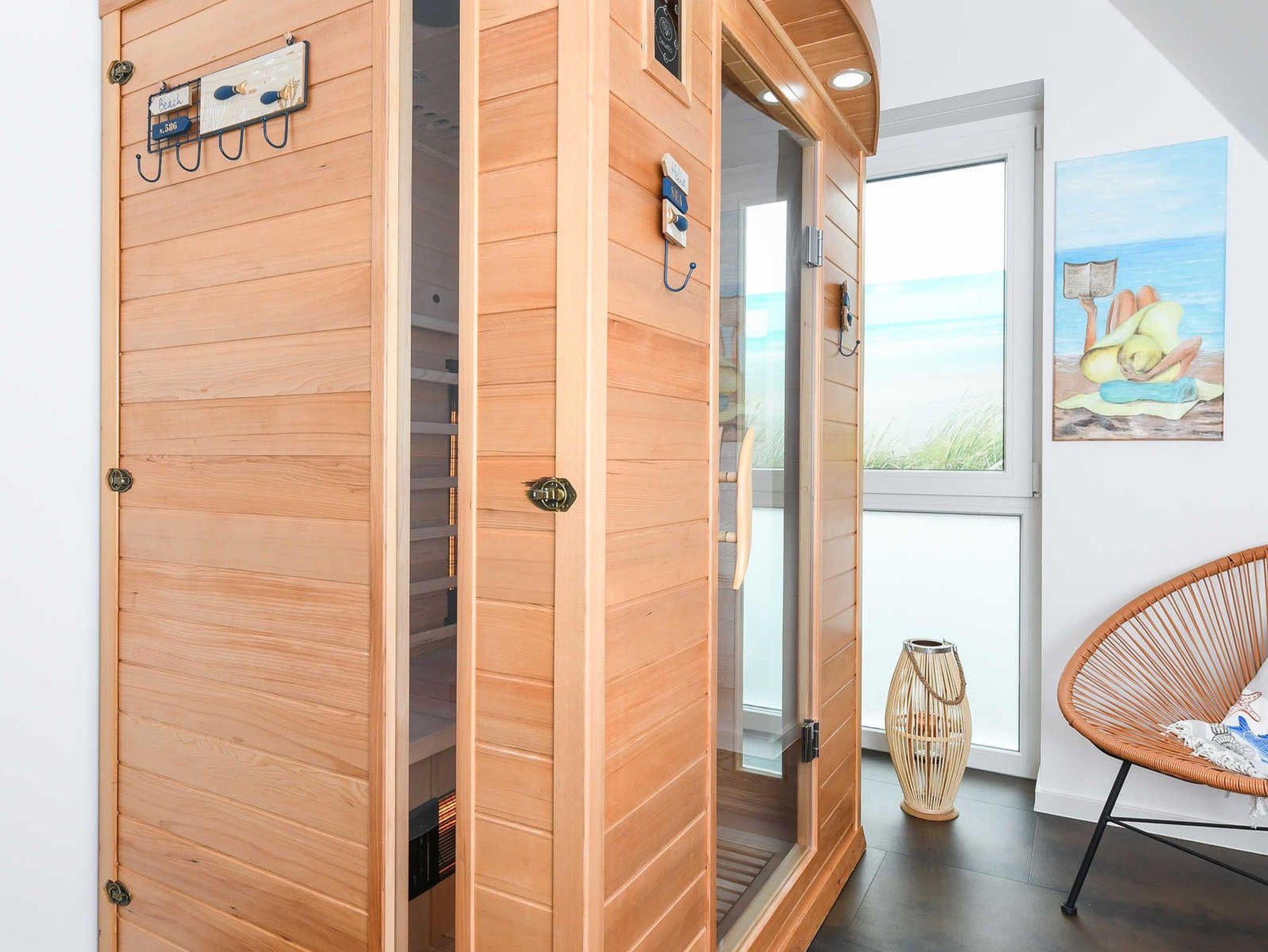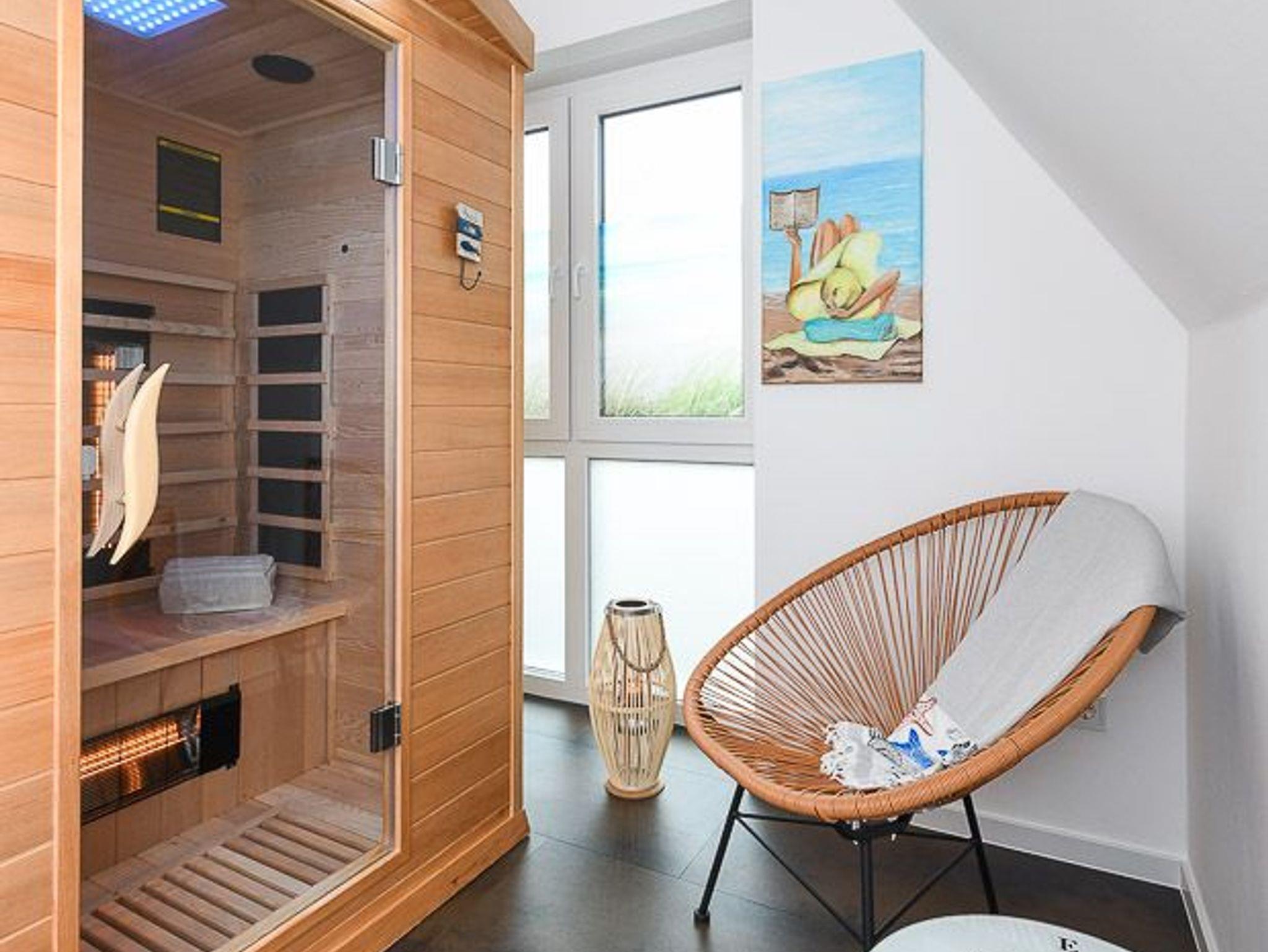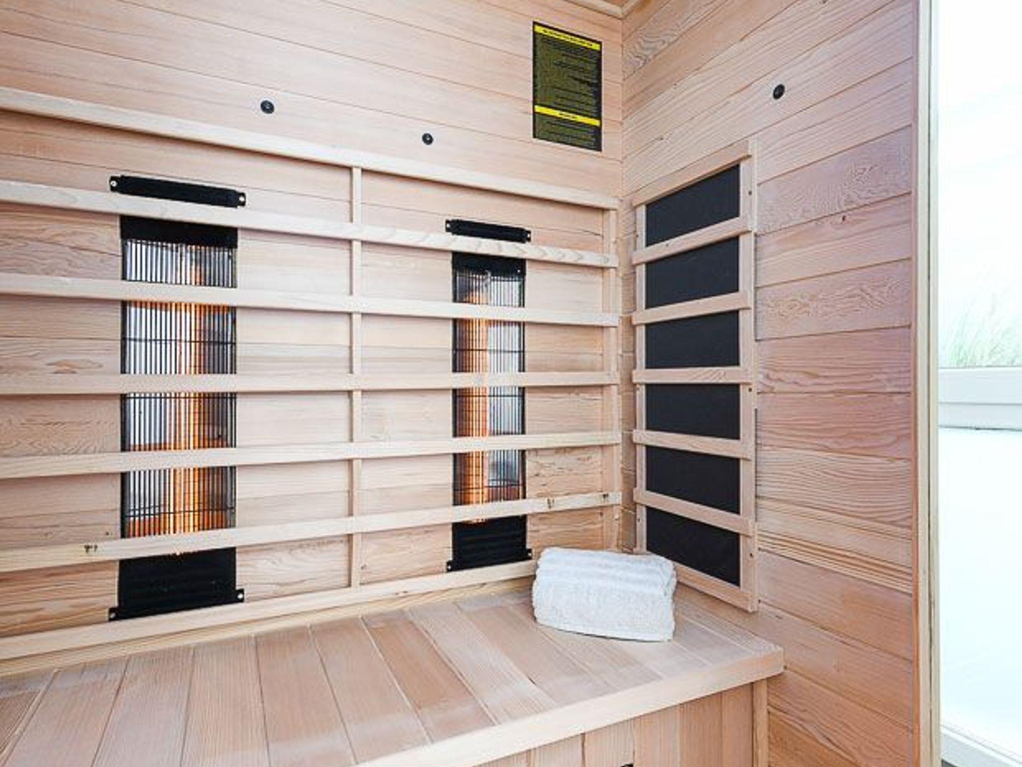 Das geräumige Ferienhaus ist ungefähr 90 Quadratmeter groß. Es gibt zwei Schlafzimmer sowie zwei Badezimmer und als besonderes Extra eine Infrarot-Lichtkabine (Infrarot-Sauna).