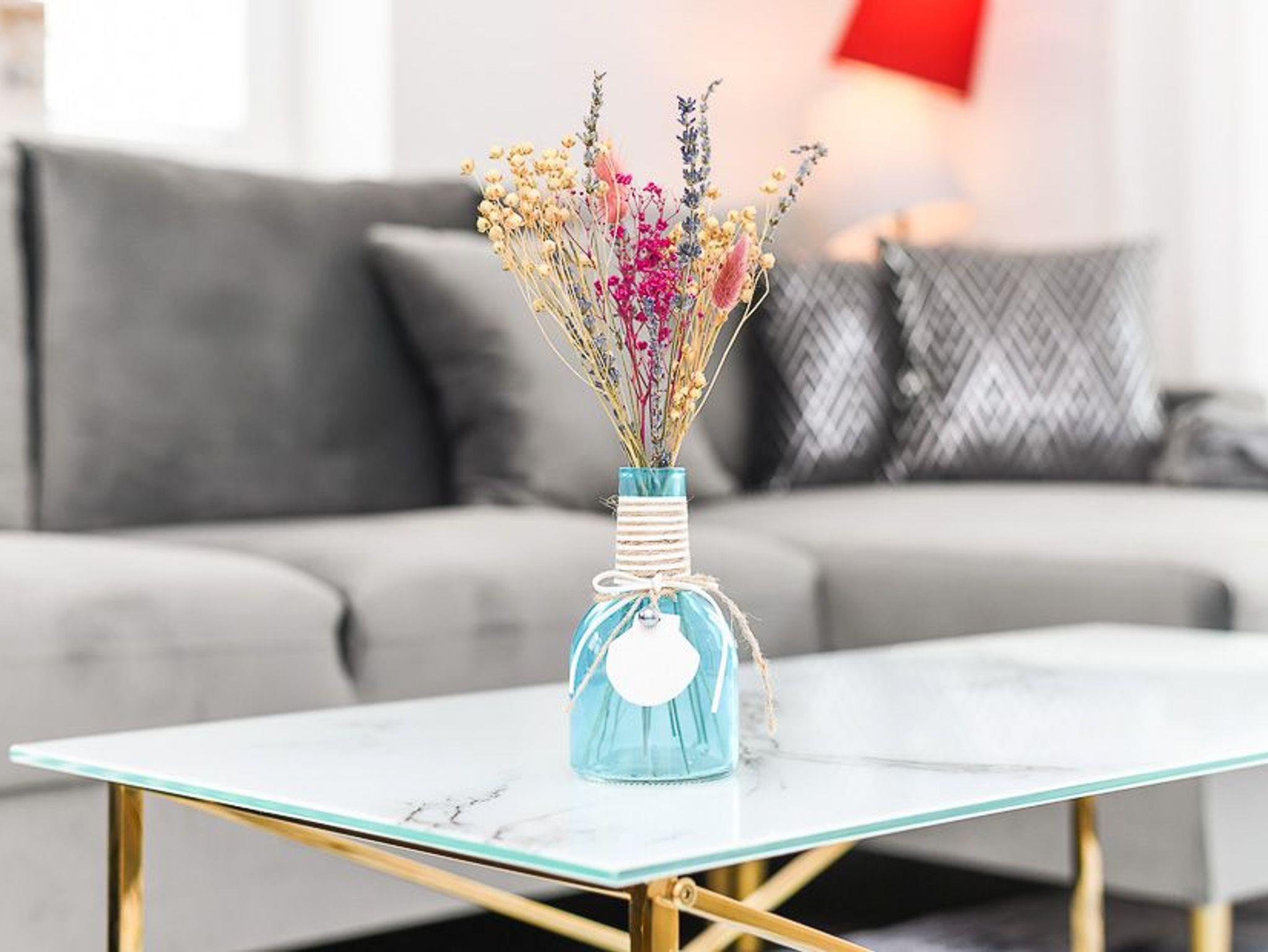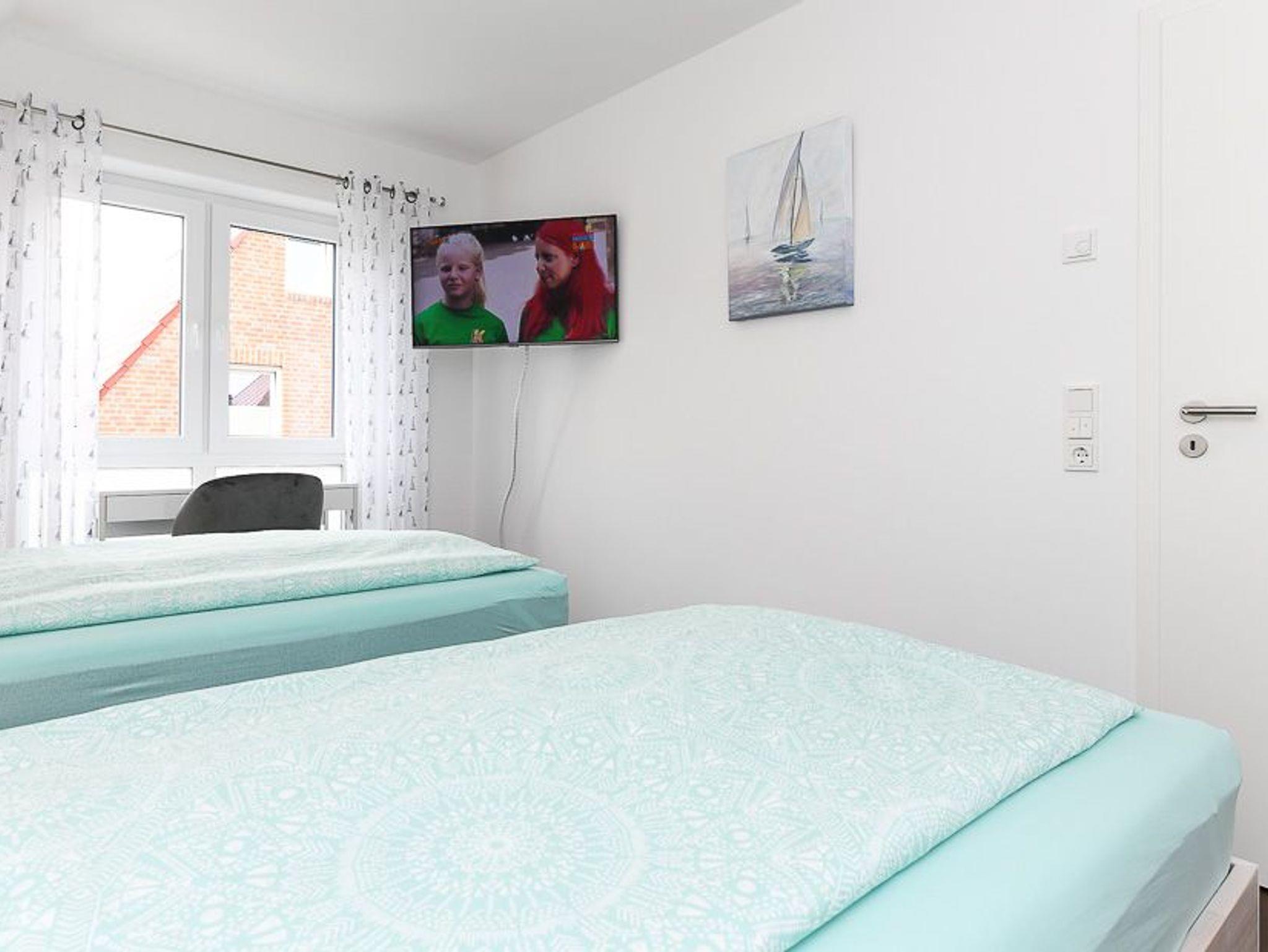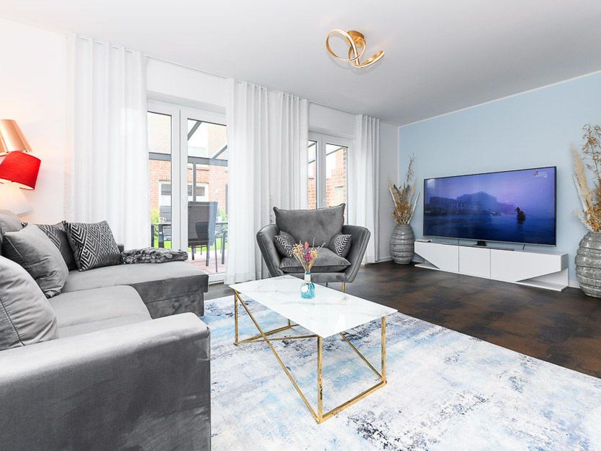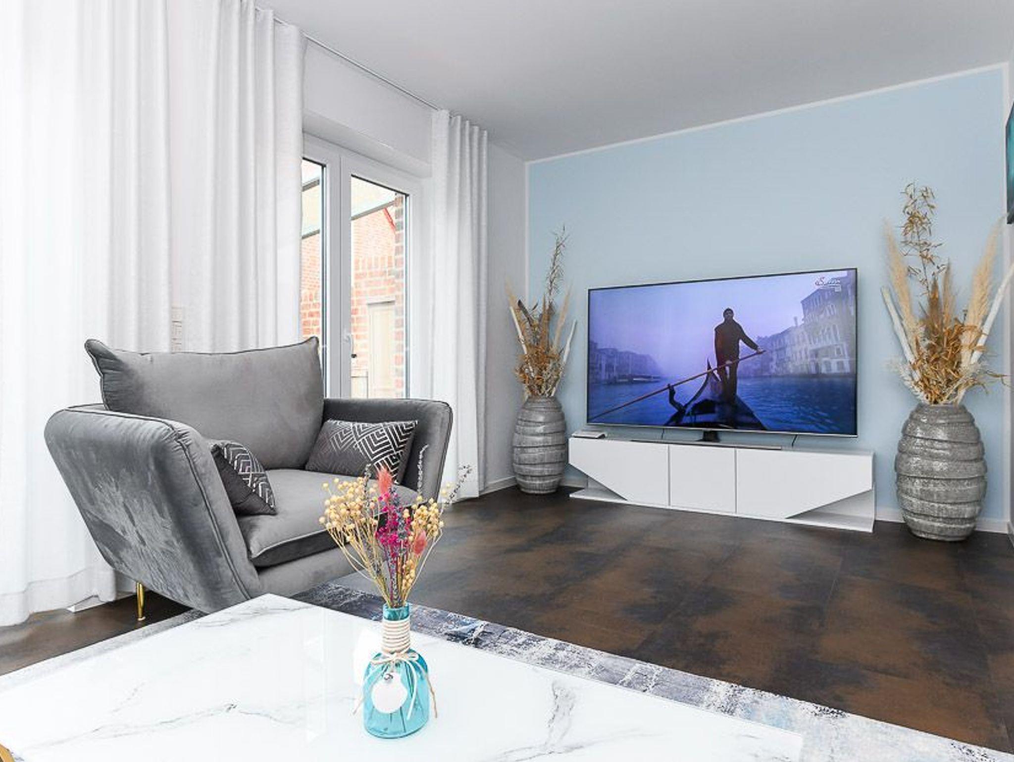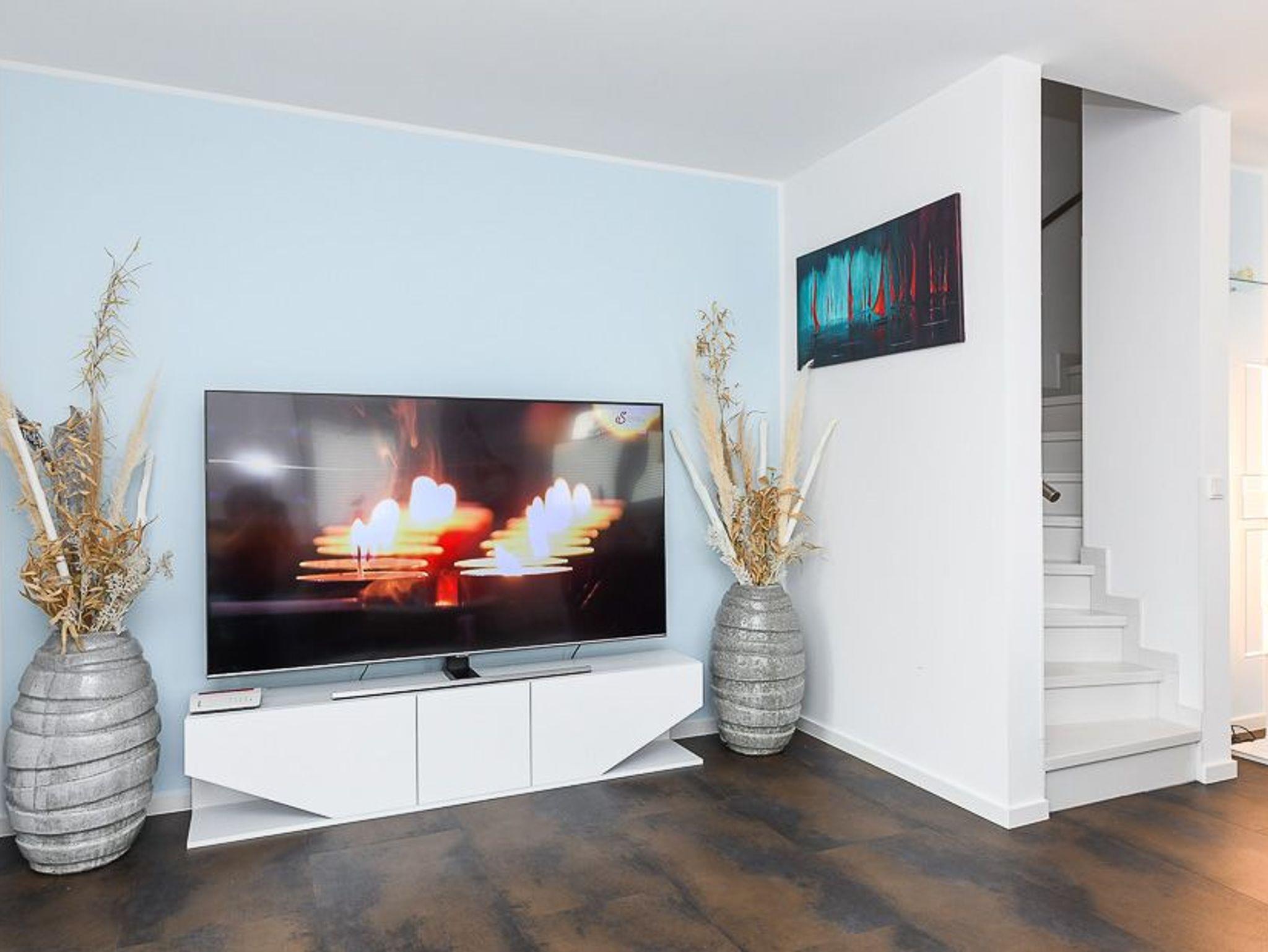Im Wohnzimmer steht ein bequemes Schlafsofa bereit für einen 5. Gast.