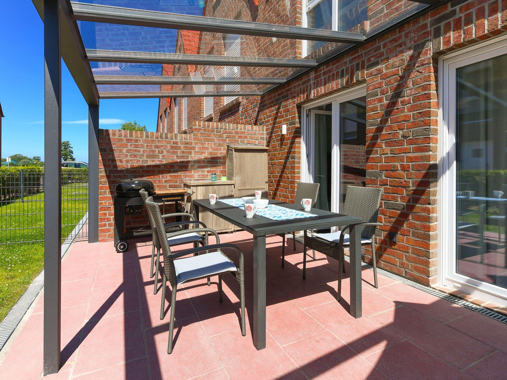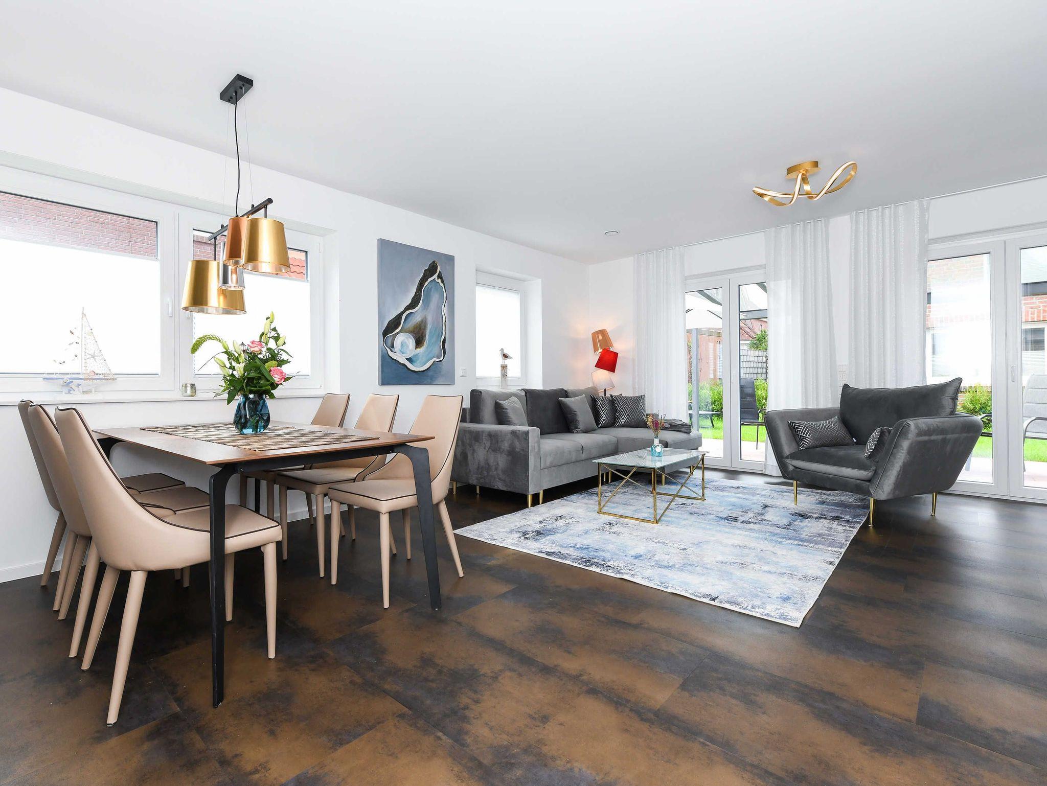 Das Ferienhaus „Nordseeperle“ ist damit optimal geeignet für Ihren Nordseeurlaub mit zwei bis fünf Personen. Sehr gemütlich und großzügig gestaltet ist auch das große Wohn- und Esszimmer mit einem abgeteilten Küchenbereich und mit einer schönen sonnigen anliegenden Terrasse die überdacht ist.