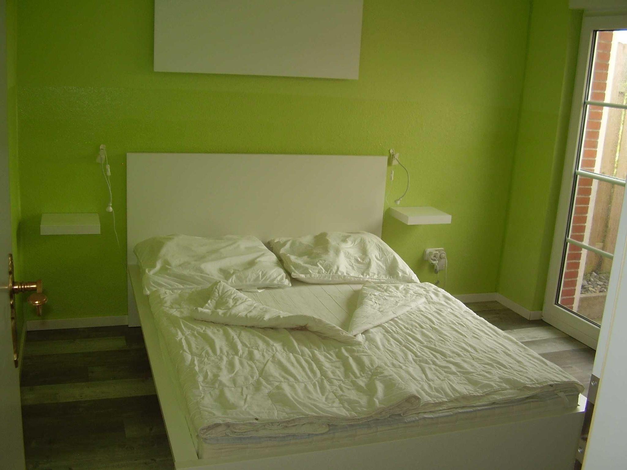 Ein Schlafzimmer mit Doppelbett.