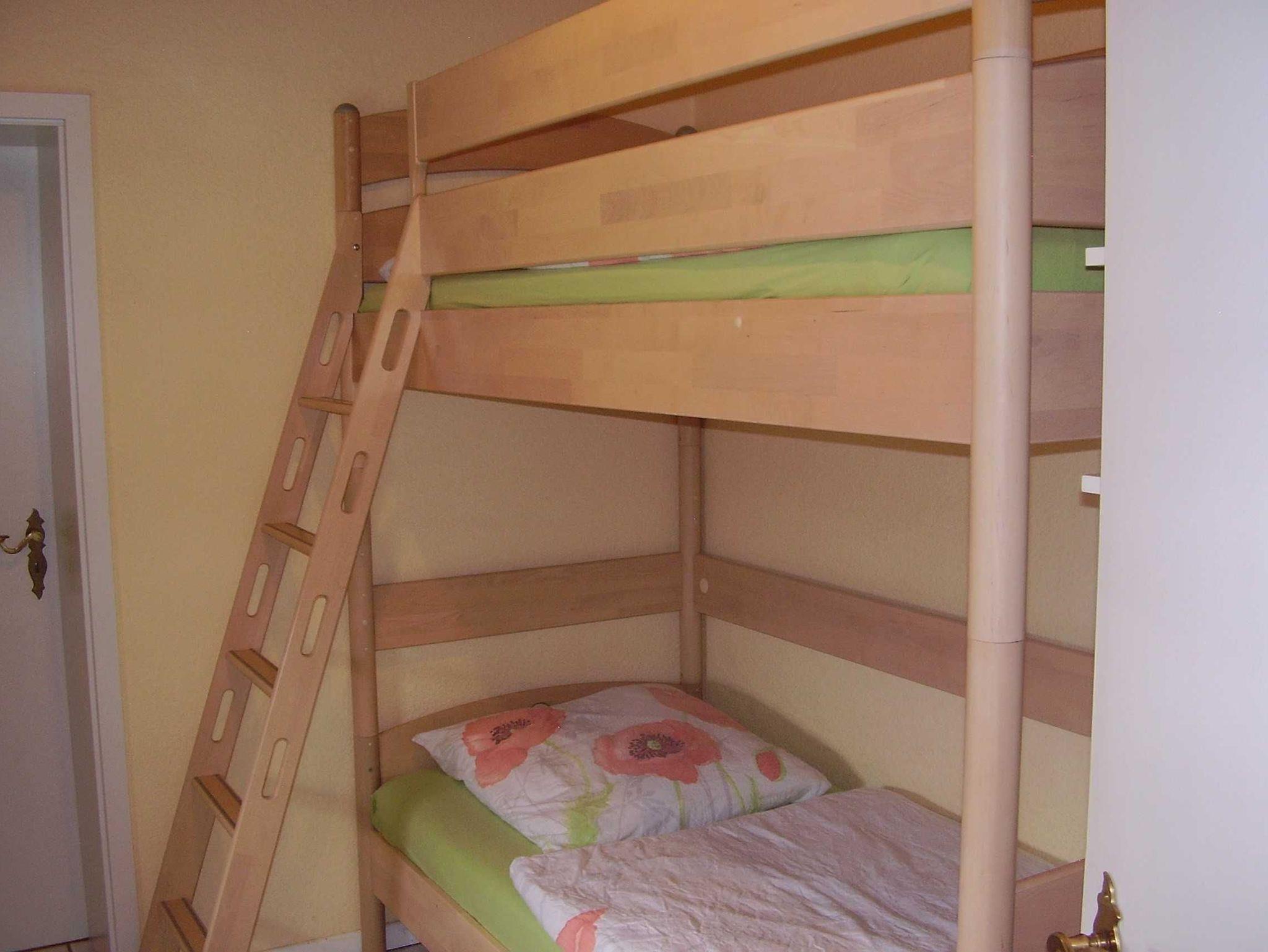 Ein Schlaf- oder Kinderzimmer mit Doppelbett mit durchgehender Matratze.