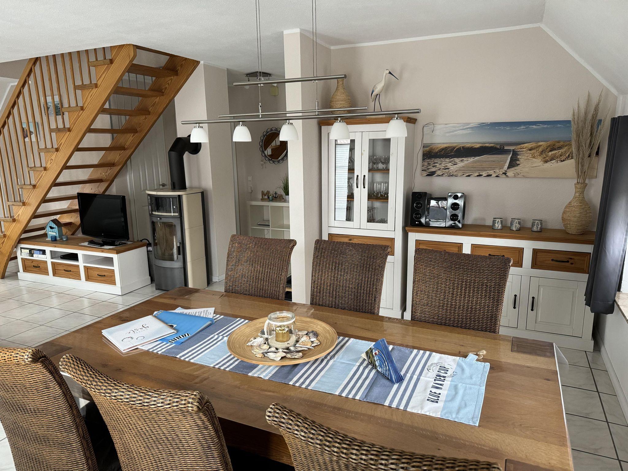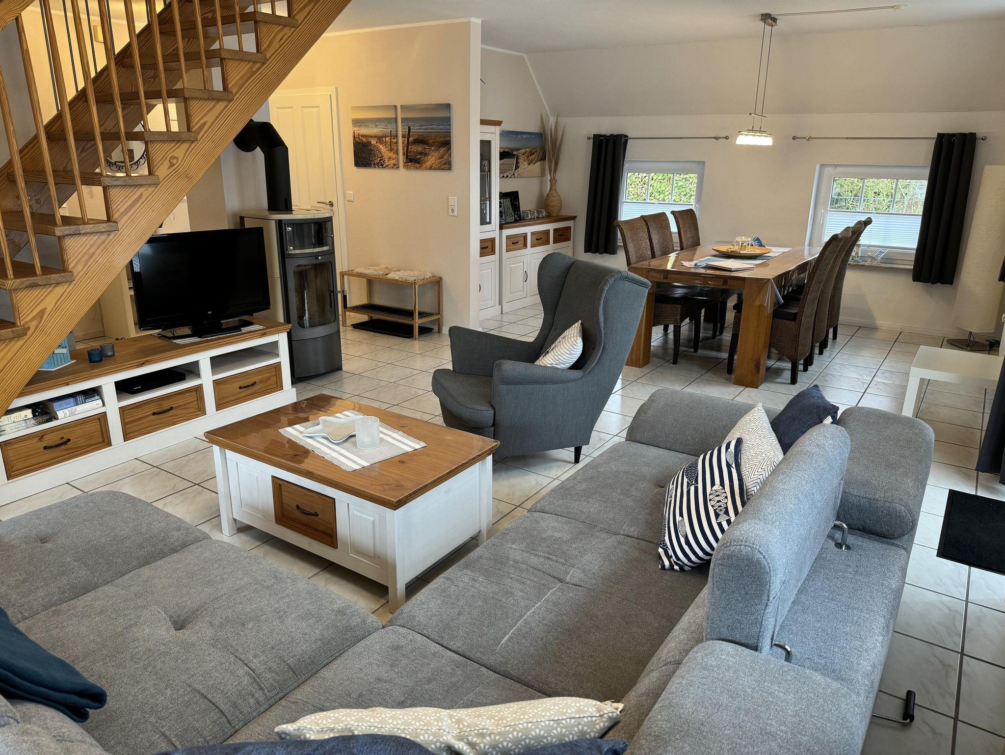 Großzügig geschnittener, offener und heller Wohn- und Essbereich mit Kaminofen, sowie einer ausziehbaren Wohnlandschaft, inkl. einem großen Esstisch für 6-8 Personen. Außerdem finden Sie verschiedene Gesellschaftsspiele, DVD's und Bücher.