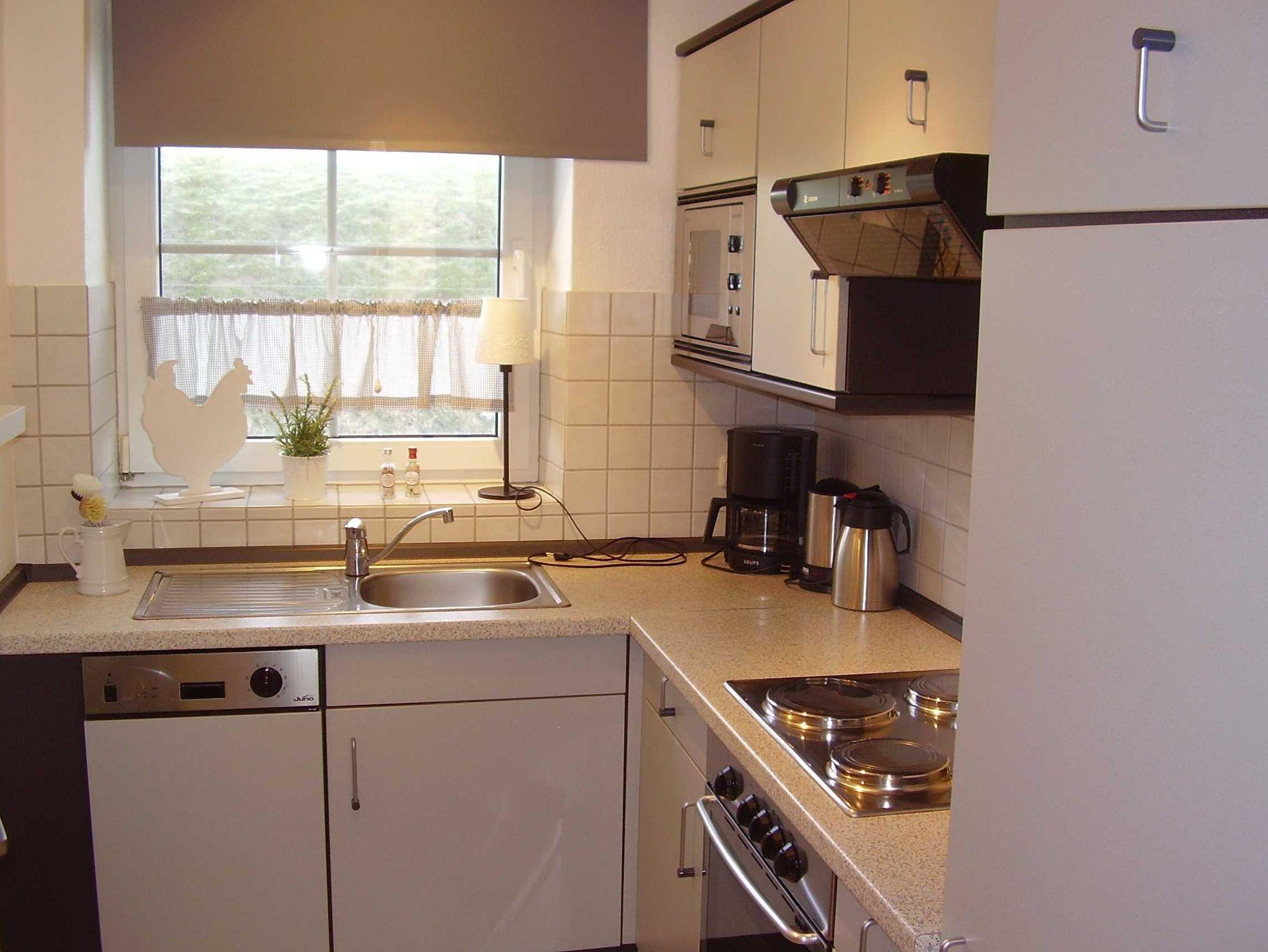 Separate Küche mit Einbauküche mit 4-Plattenherd mit Backofen, Kühlschrank mit Gefrierfach, Spülmaschine, Mikrowelle und allen erforderlichen Elektrogeräten. Ausreichend Töpfe und Pfannen, Gedecke und Bestecke.