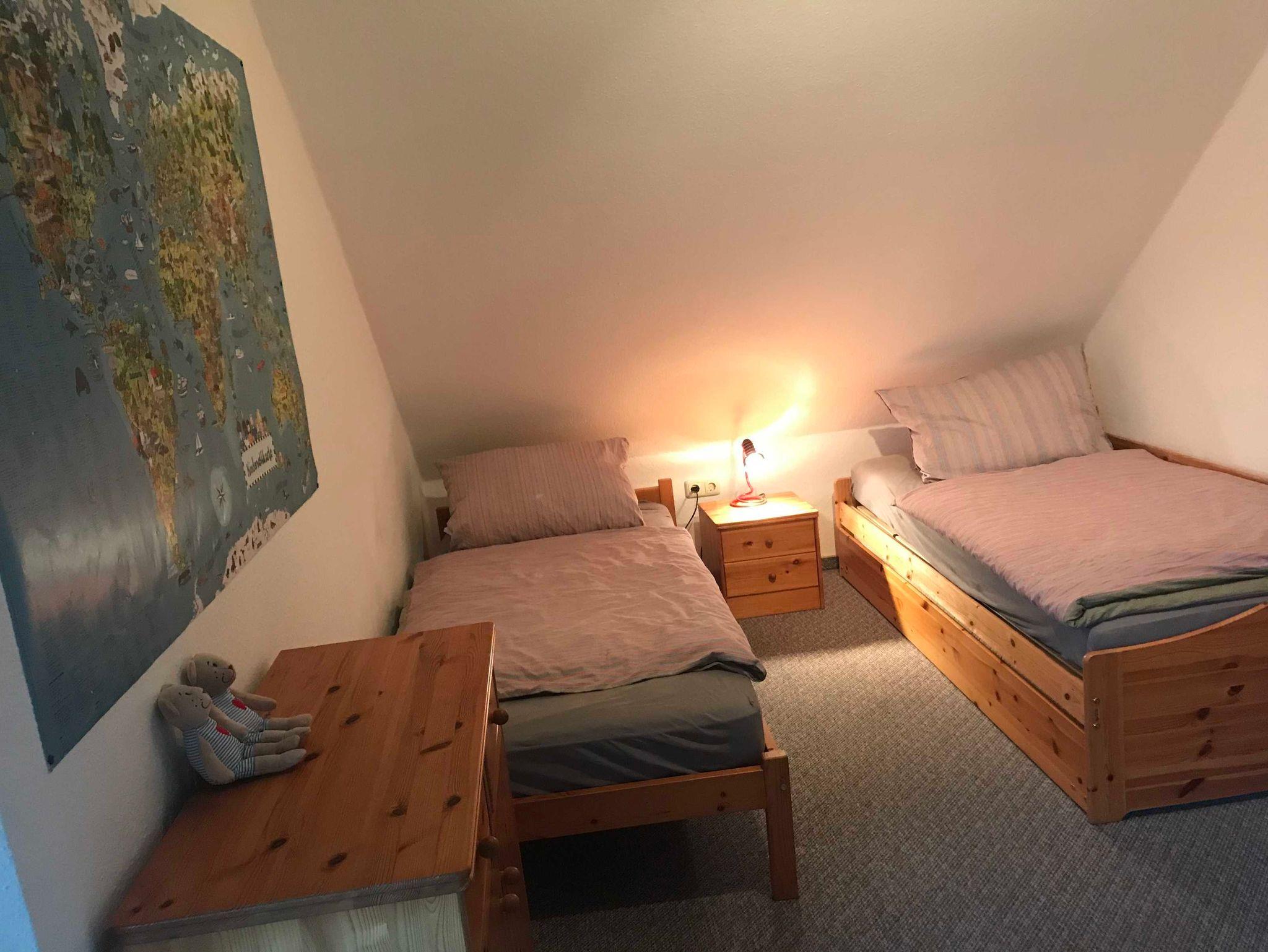 Ein Schlafzimmer mit Doppelbett, ein Schlaf- oder Kinderzimmer mit einem Einzelbett und einem ausziehbaren Kojenbett mit 2 Schlafplätzen.