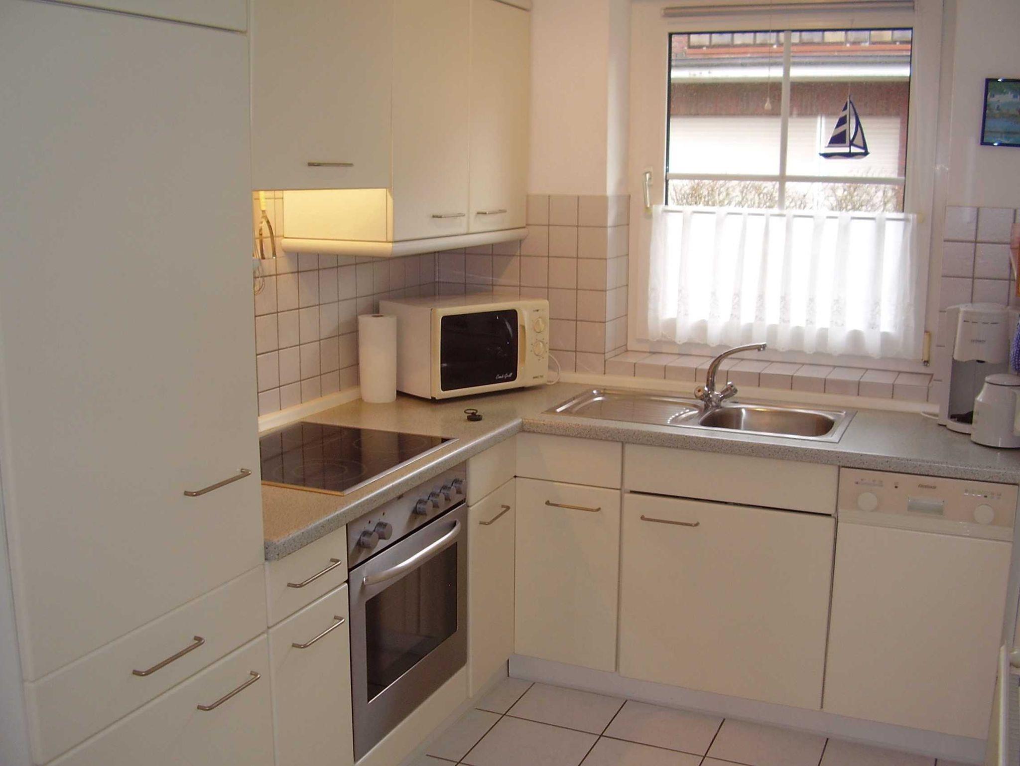 Küche mit Spülmaschine, Kühlschrank mit Gefrierfach, VierPlattenElektroherd mit Ceranfeld und Backofen und allen erforderlichen Elektrogeräten.