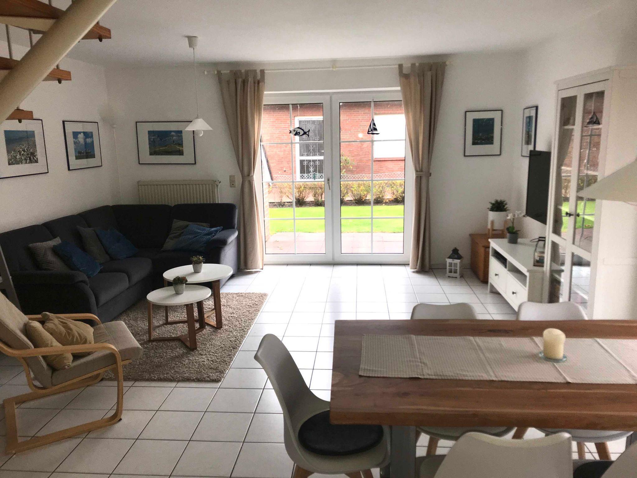 Offener Wohn- und Essbereich, gemütlicher Couchgarnitur und Farb-TV, Essgruppe mit Bestuhlung. Von hieraus Zugang zur Terrasse mit Gartenbestuhlung und dem kl. Garten.