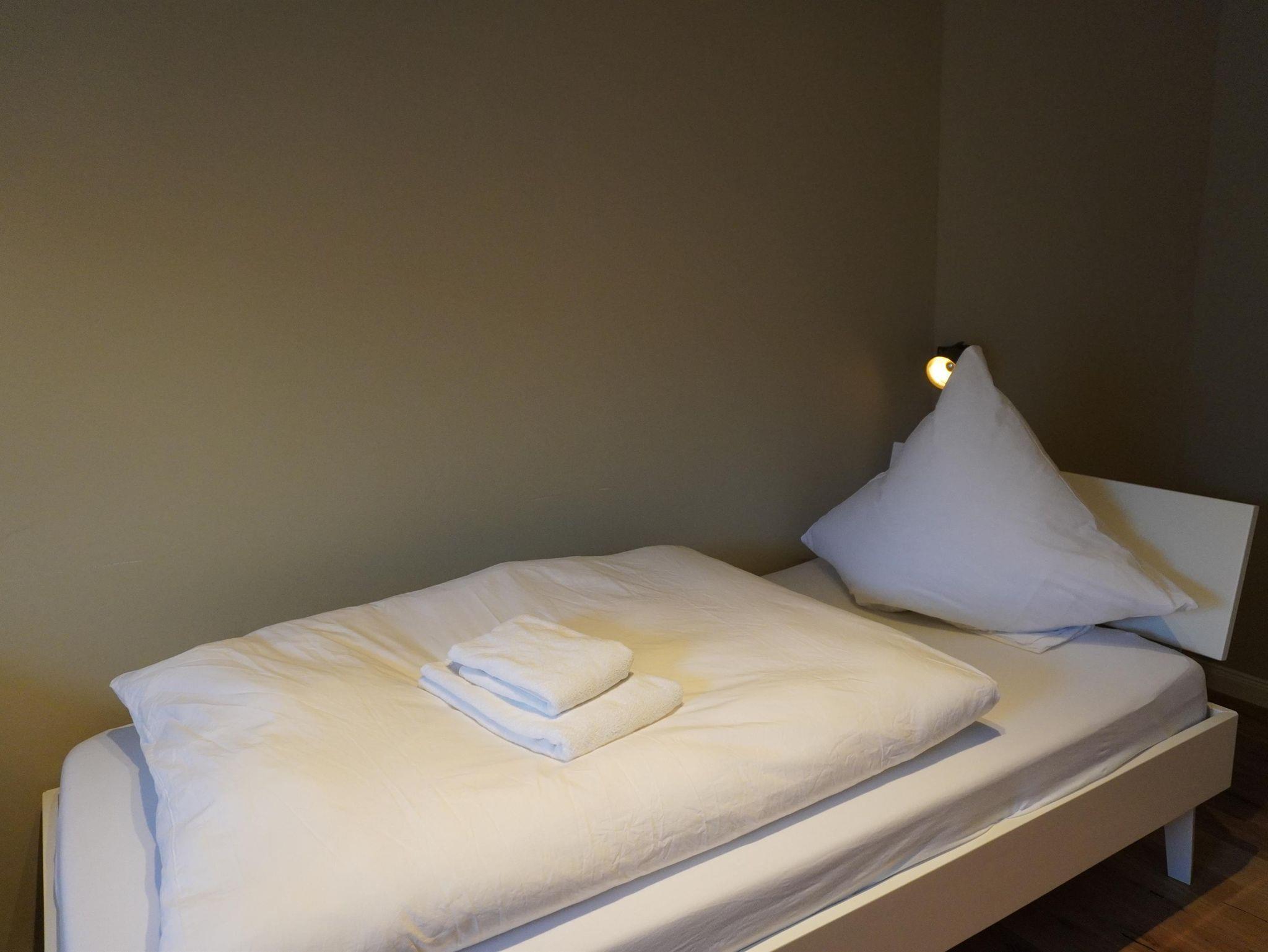 Studio: Das Studio ist mit 34m² die kleinste aller sieben Wohnungen. Das lichtdurchflutete Zimmer ist mit einem kombinierten Wohn- und Schlafbereich einen Hotelzimmer nachempfunden. Die kleine Küchenniesche bietet dennoch genügend Platz zum Kochen. Das Badezimmer ist mit einem WC und einer Dusche ausgestattet.