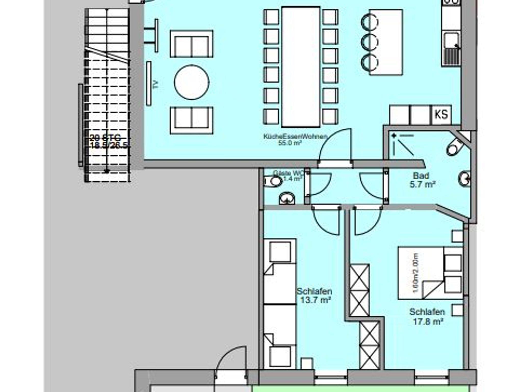 Kinderzimmer: Auf insgesamt 100m² können bis zu sieben Personen Platz finden. Der lichtdurchflutete Koch- und Essbereich lädt mit der großen, vollausgestatteten Küche zum Kochen ein. Das große Wohnzimmer ist mit einer gemütlichen Couch, einem Arbeitsplatz und einen Sat-TV ausgestattet. Als Schlafmöglichkeit dienen die zwei Doppelzimmer und das Zweibettzimmer. Das Badezimmer besitzt ein WC und eine große Dusche. Der Balkon ist nach Süden ausgerichtet.