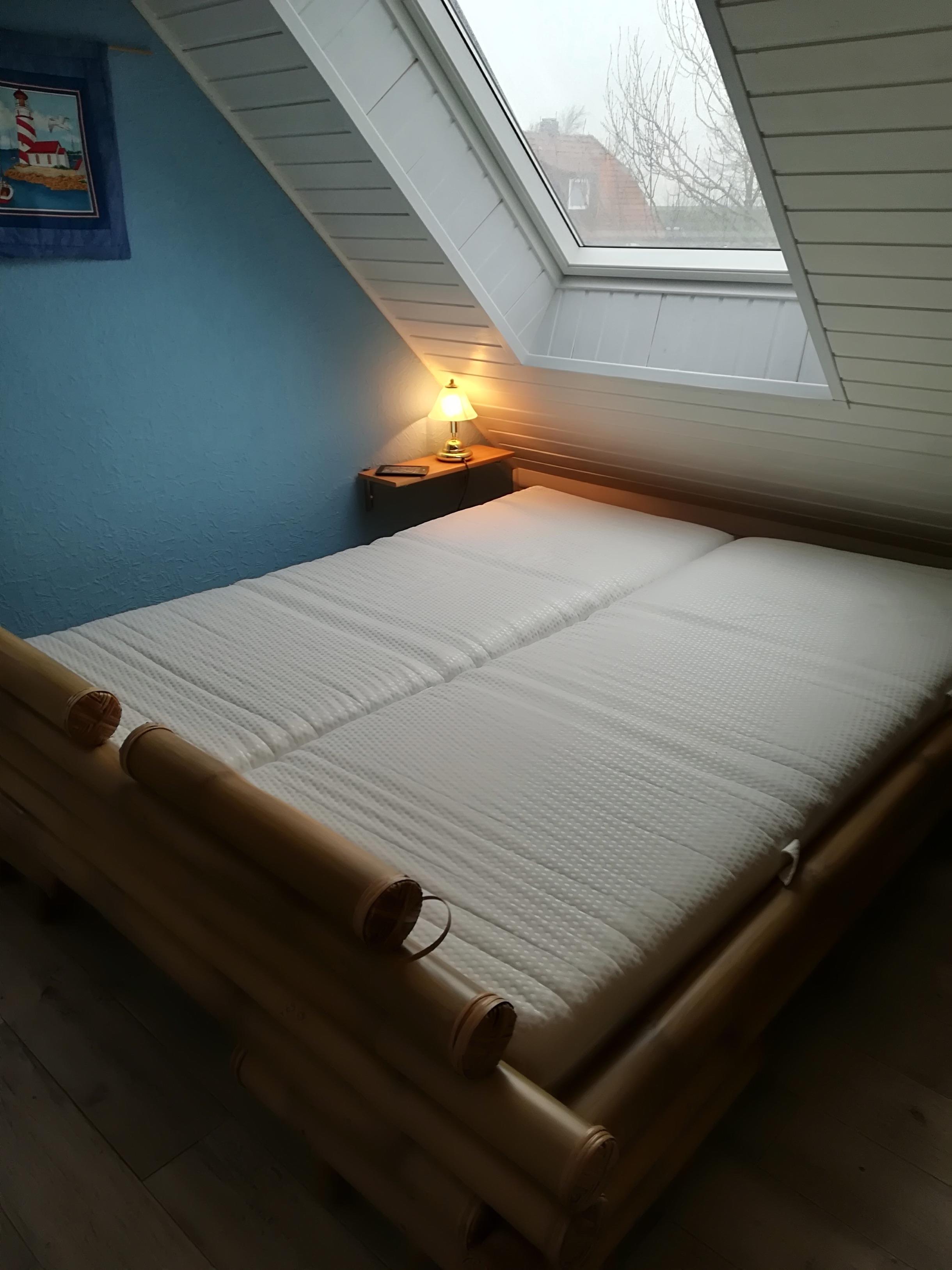 Unsere schöne Ferienwohnung ist ein Zweiraumappartment auf zwei Etagen, mit einer Gesamtgröße von ca.35qm. Sie besteht aus 2 Räumen, neben dem modern eingerichteten Badezimmer sowie den Schlafbereich im Obergeschoß, befindet sich der Wohn-und Eß-Bereich im Untergeschoß. Diese beiden Etagen sind durch eine Holzwendeltreppe miteinander verbunden. Es gibt eine separate Sitzecke am Haus mit Tisch, Stühlen und Sonnenschirm, die gern zum Relaxen oder auch nur zum Frühstücken genutzt werden kann. Außerdem gehört zur Wohnung ein Gemeinschaftsschuppen sowie eine Gemeinschafts-Liegewiese, die gern zum Grillen oder Verweilen genutzt werden kann. Eine Waschmaschine befindet sich im Gemeinschaftssschuppen und kann gebührenpflichtig genutzt werden.