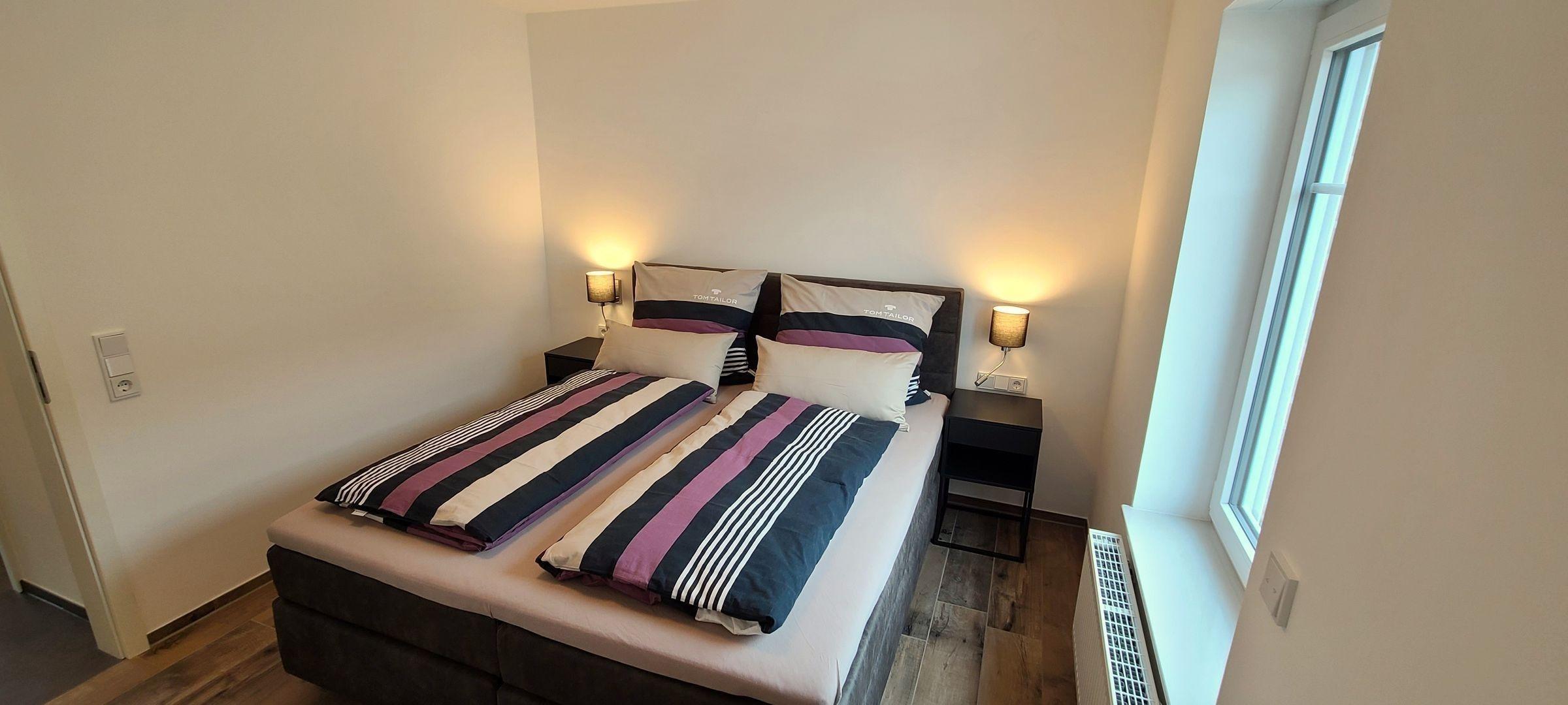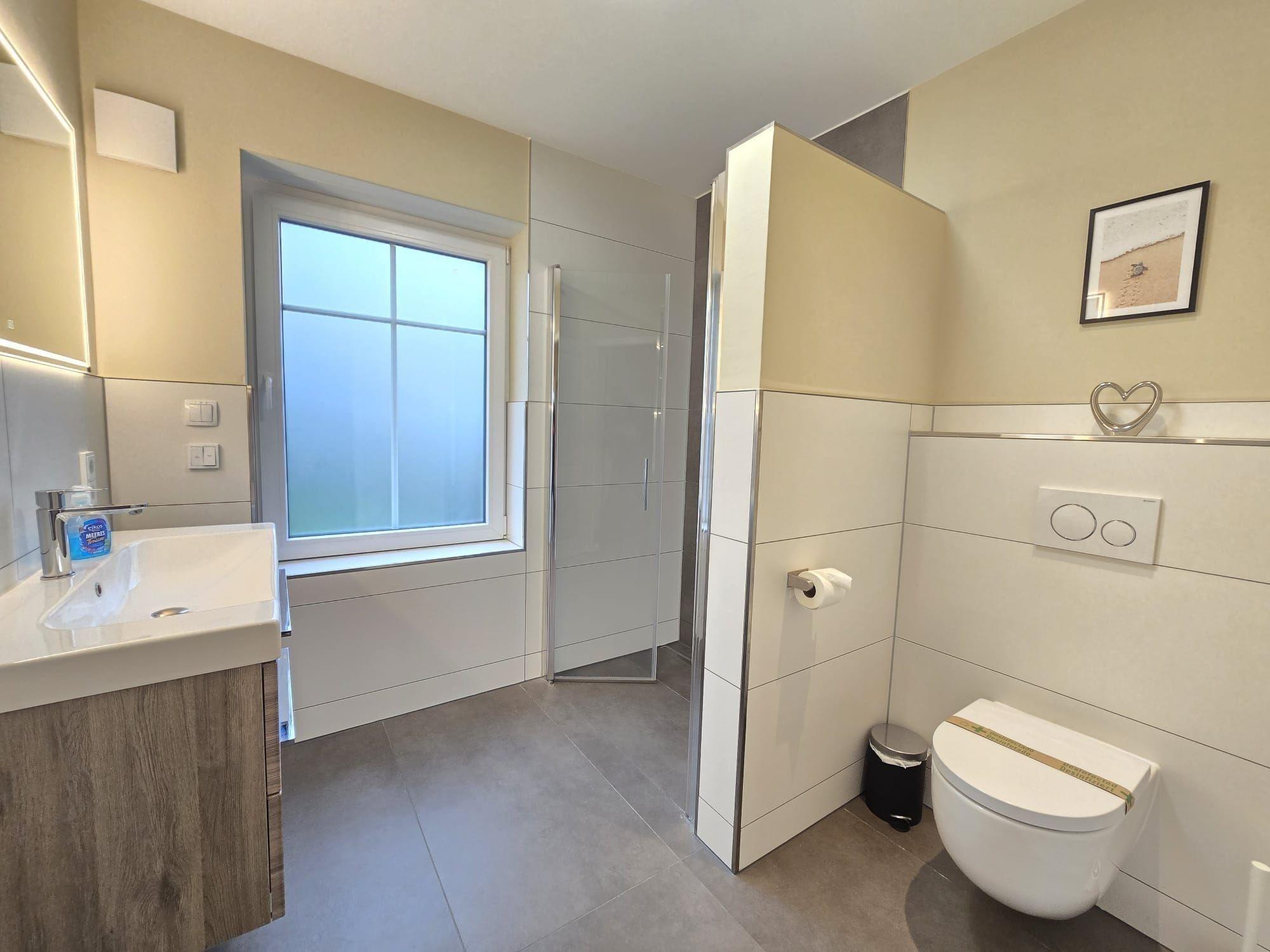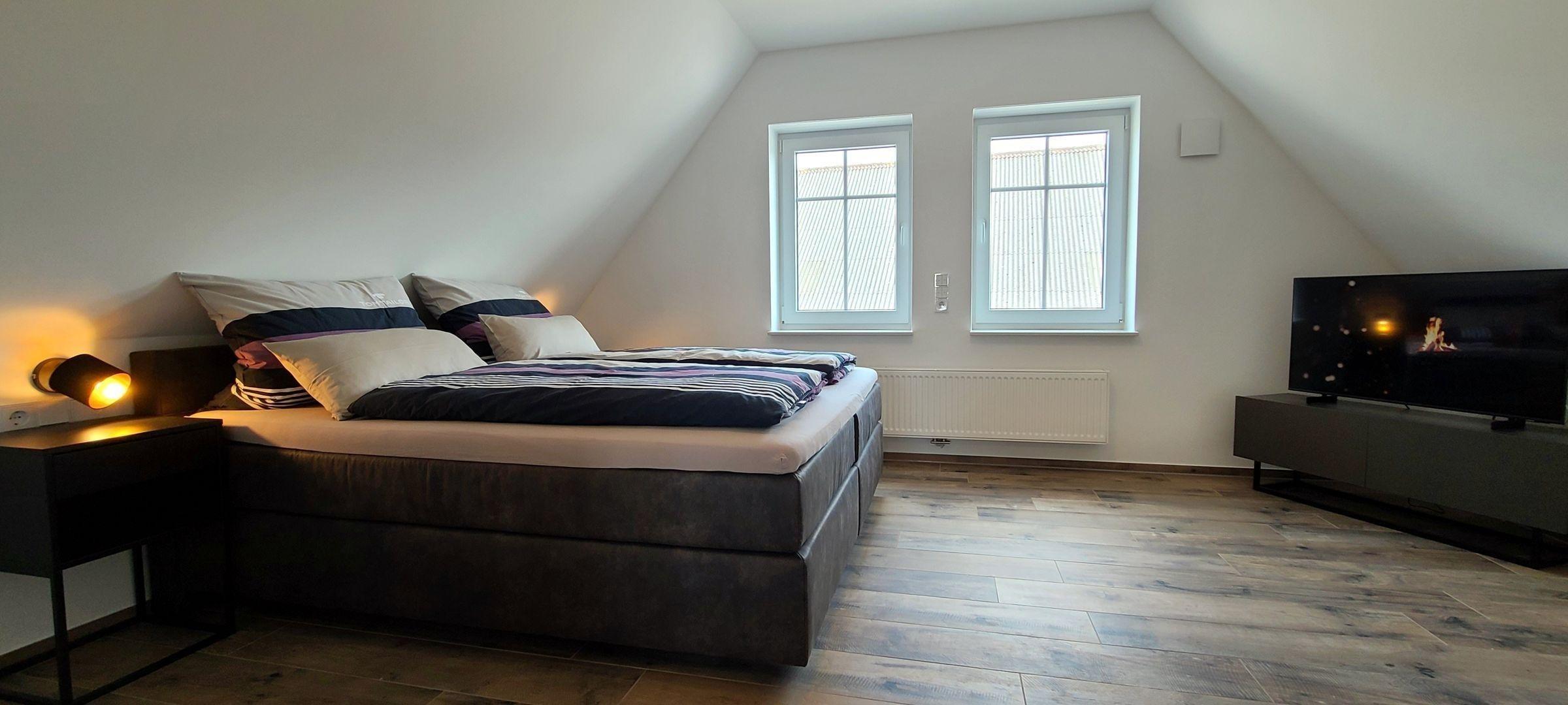 Die Ferienwohnung bietet eine großzügige und komfortable Unterkunft, ideal für Familien oder Gruppen. Mit drei Schlafzimmern, die mit zwei Doppelbetten und zwei Einzelbetten ausgestattet sind, findet jeder seinen Rückzugsort. Die beiden Badezimmer, darunter eines mit bodengleicher Dusche und Fenster, garantieren optimalen Komfort.