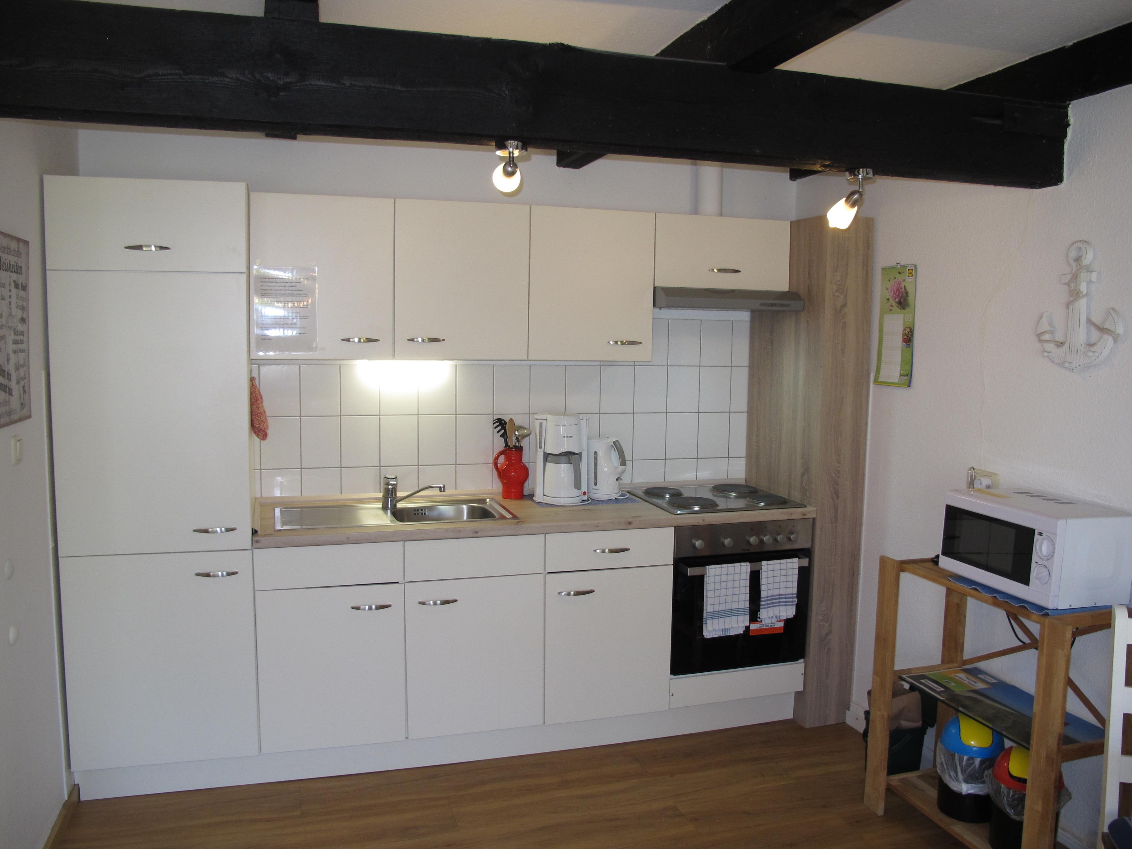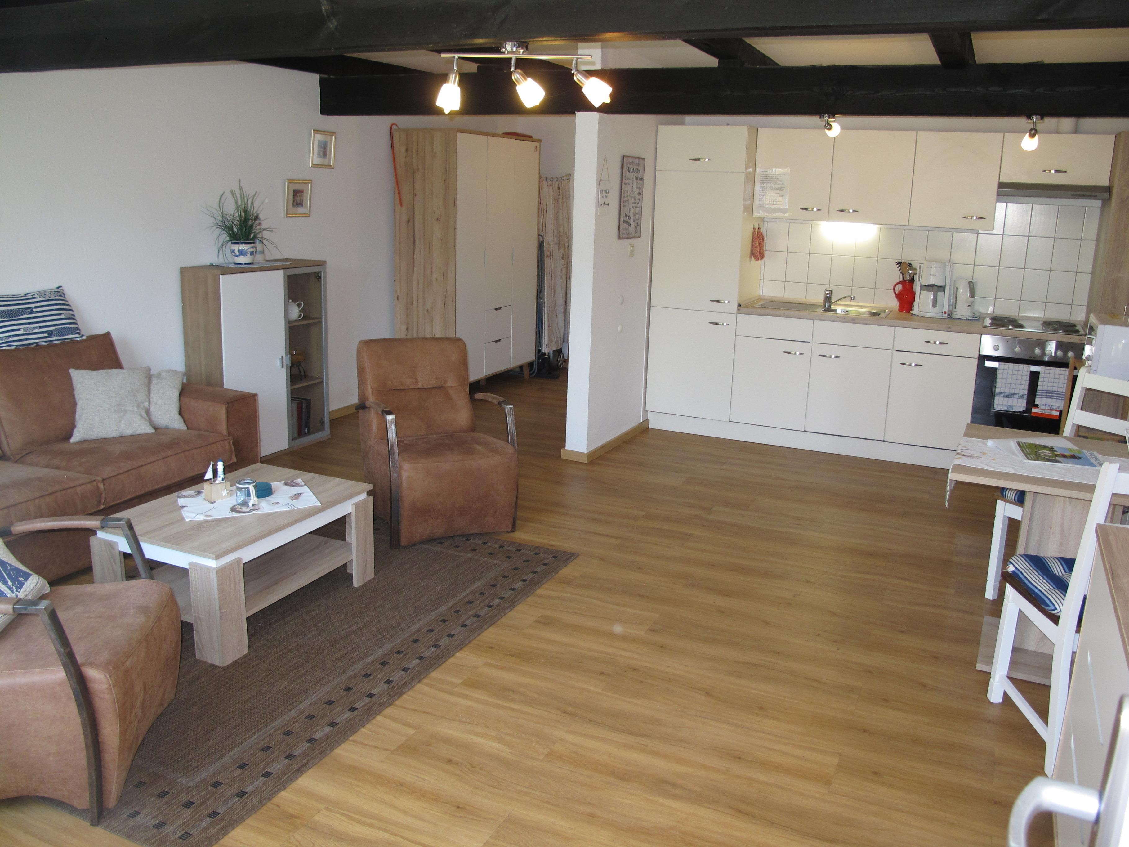 Zugang über Terrasse und separaten Eingang in : großen Wohnraum mit Leder-Sitzgruppe und Eßplatz. Offene Küche mit Einbauherd (4 Platten, Backofen), Mikrowelle, Kaffeemaschine, Wasserkocher, Toaster und Kühlschrank mit Gefrierfach. Doppelzimmer. Renovierte und moderne Dusche/WC. NICHTRAUCHEROBJEKT !