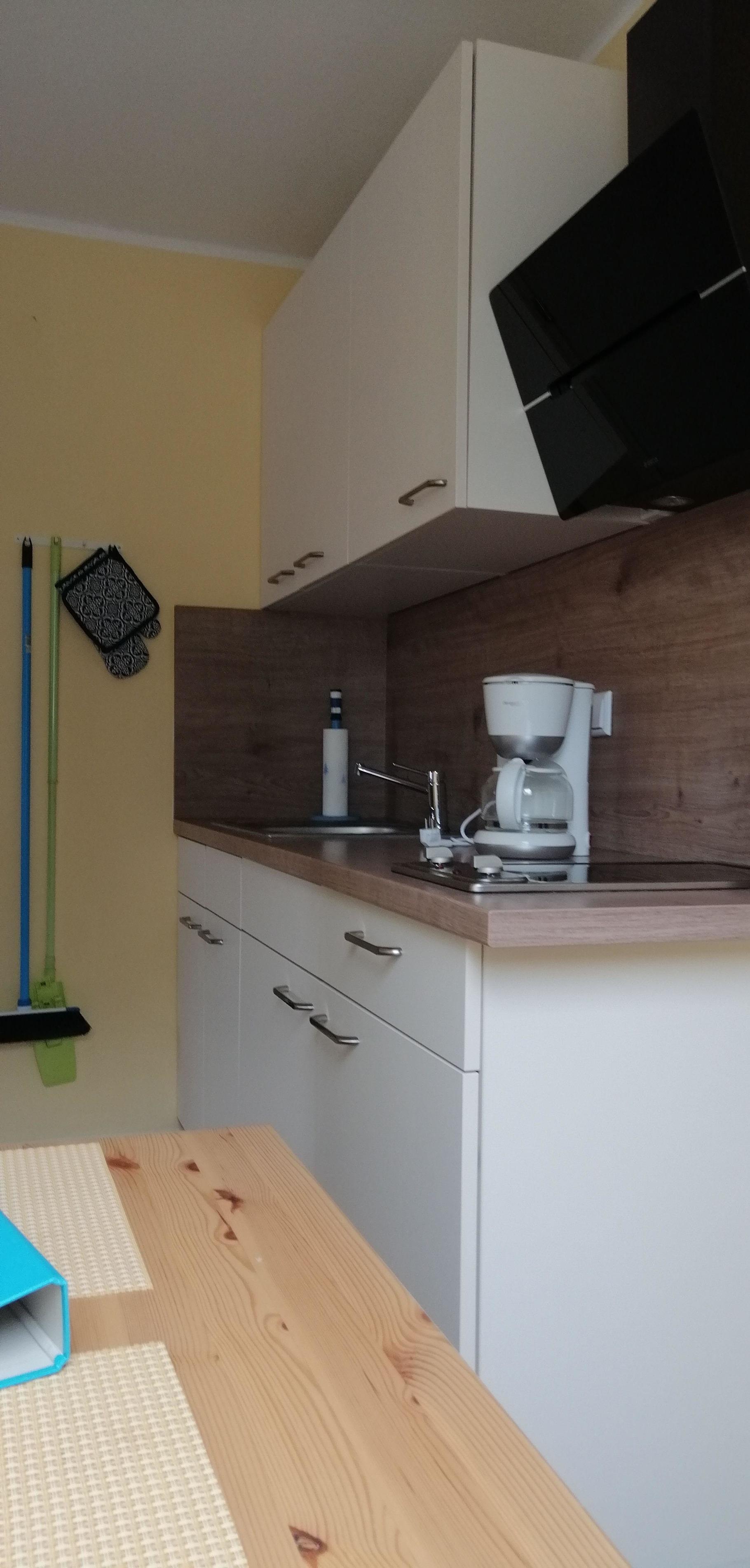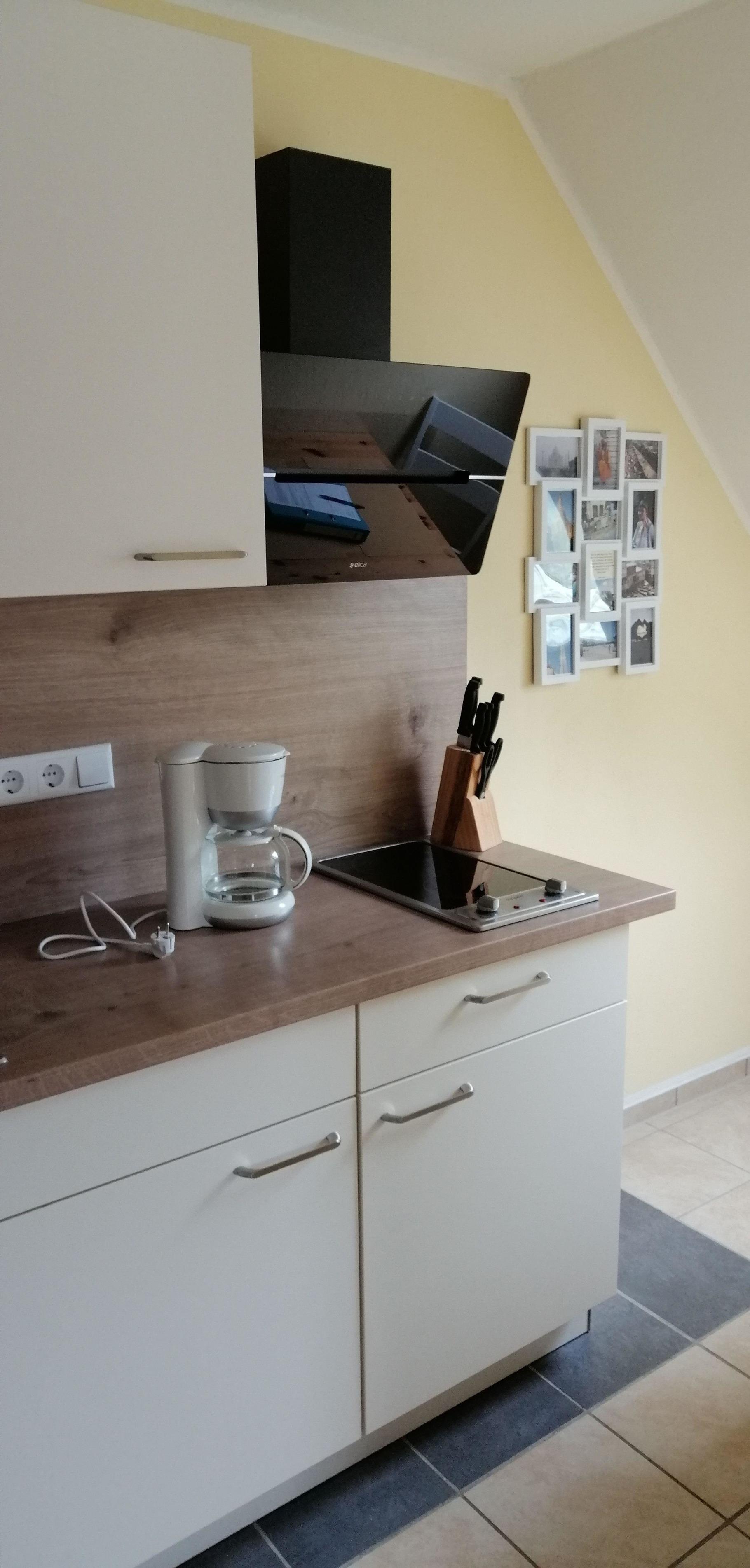 Zur Wohnung gehören eine Küche mit Kühlschrank, Toaster, Kaffeemaschine, Wasserkocher und Herd zwei Herdplatten.