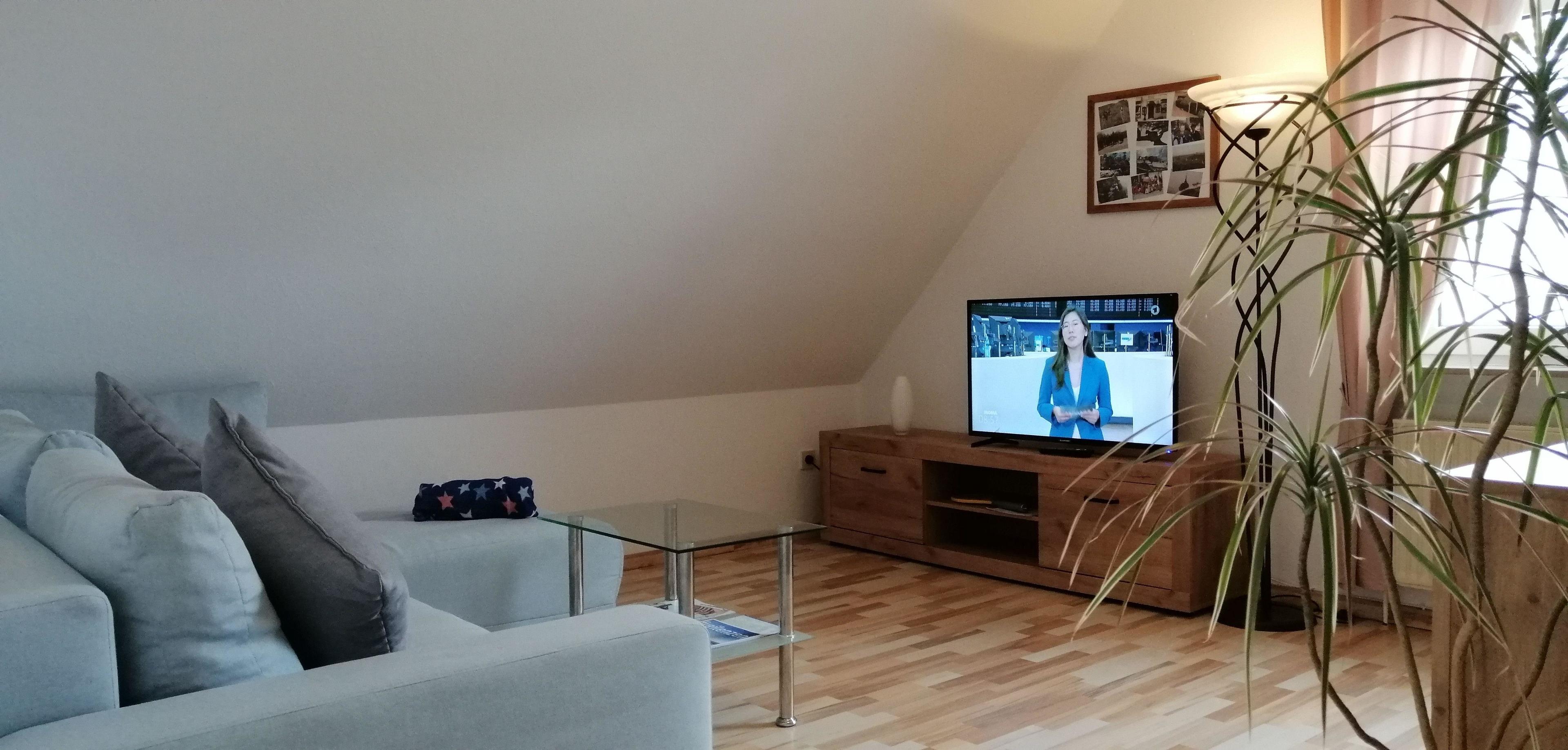 Wohnzimmer mit SAT-TV, Couch und Anrichte.