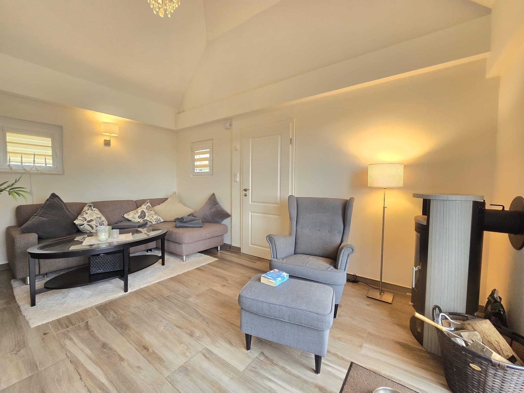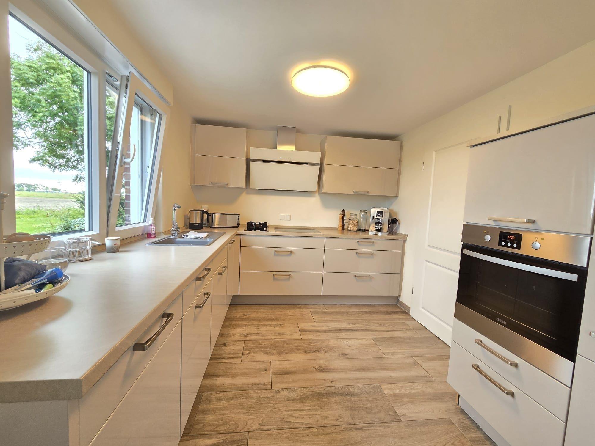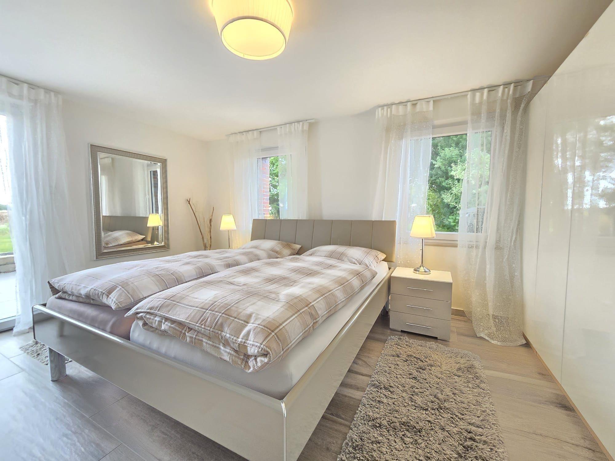 Die Ferienwohnung bietet eine moderne und komfortable Ausstattung, ideal für einen entspannten Aufenthalt. Sie verfügt über zwei Schlafzimmer mit zwei Doppelbetten und einem Einzelbett, die Allergiker geeignet sind. Die offene Küche ist mit einem Geschirrspüler, Elektro-/Gasherd, Backofen, Mikrowelle, Kühlschrank, Kaffeemaschine und Toaster ausgestattet. Ein Kinderhochstuhl steht bereit. Das Badezimmer mit Fenster und einer bodengleichen Dusche samt einem Gäste-WC sorgt für zusätzlichen Komfort.