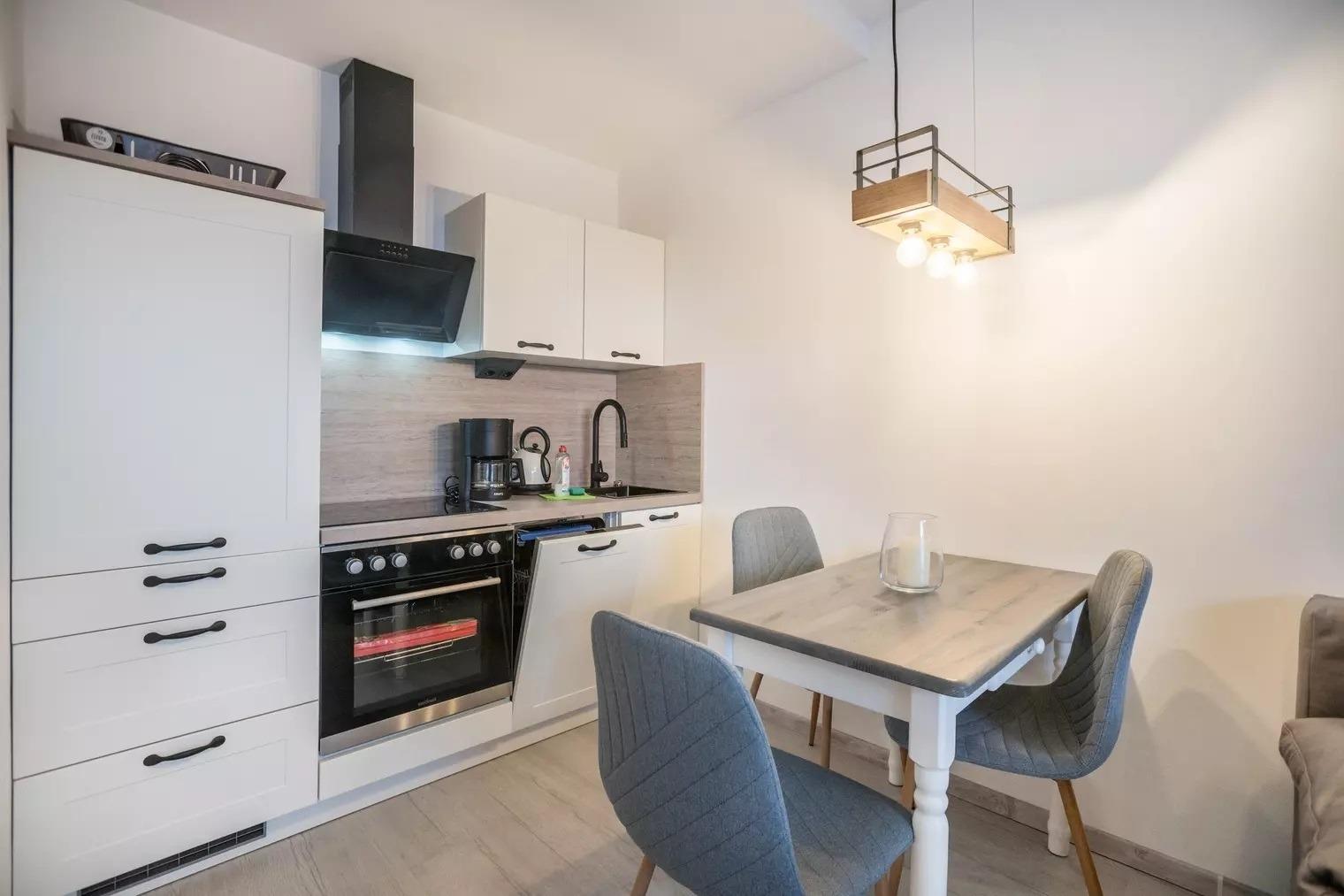 Die gut ausgestattete Küche besitzt unter anderem einen Kühlschrank, einen Herd zum Kochen und sogar eine Spülmaschine.