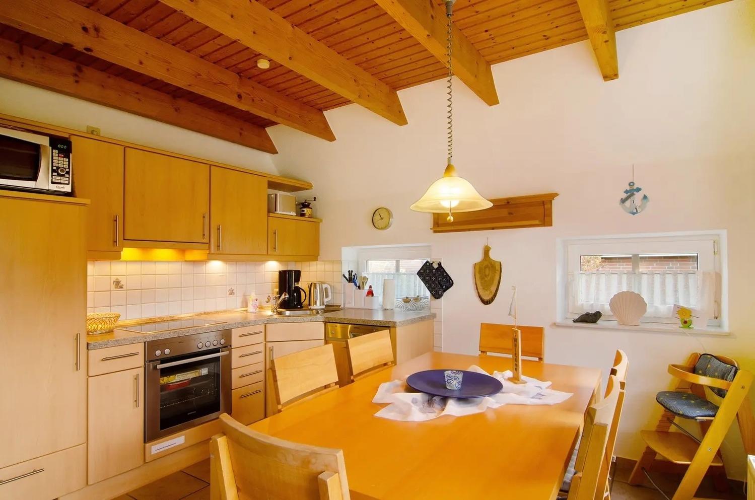 Richtige Urlaubsstimmung kommt auf der schönen Terrasse des Ferienhauses auf. Im Urlaub kochen? Los geht´s, die Küche ist gut ausgestattet, sogar mit einer Spülmaschine.