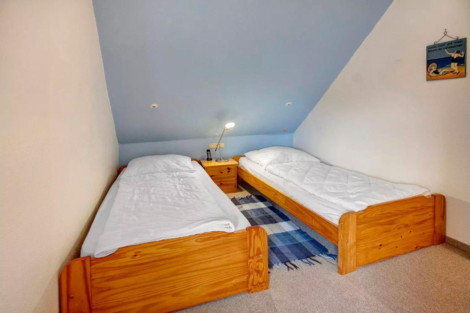 Schlafzimmer 1 hat 1 Kingsize-Bett. Schlafzimmer 2 hat 2 Einzelbetten.