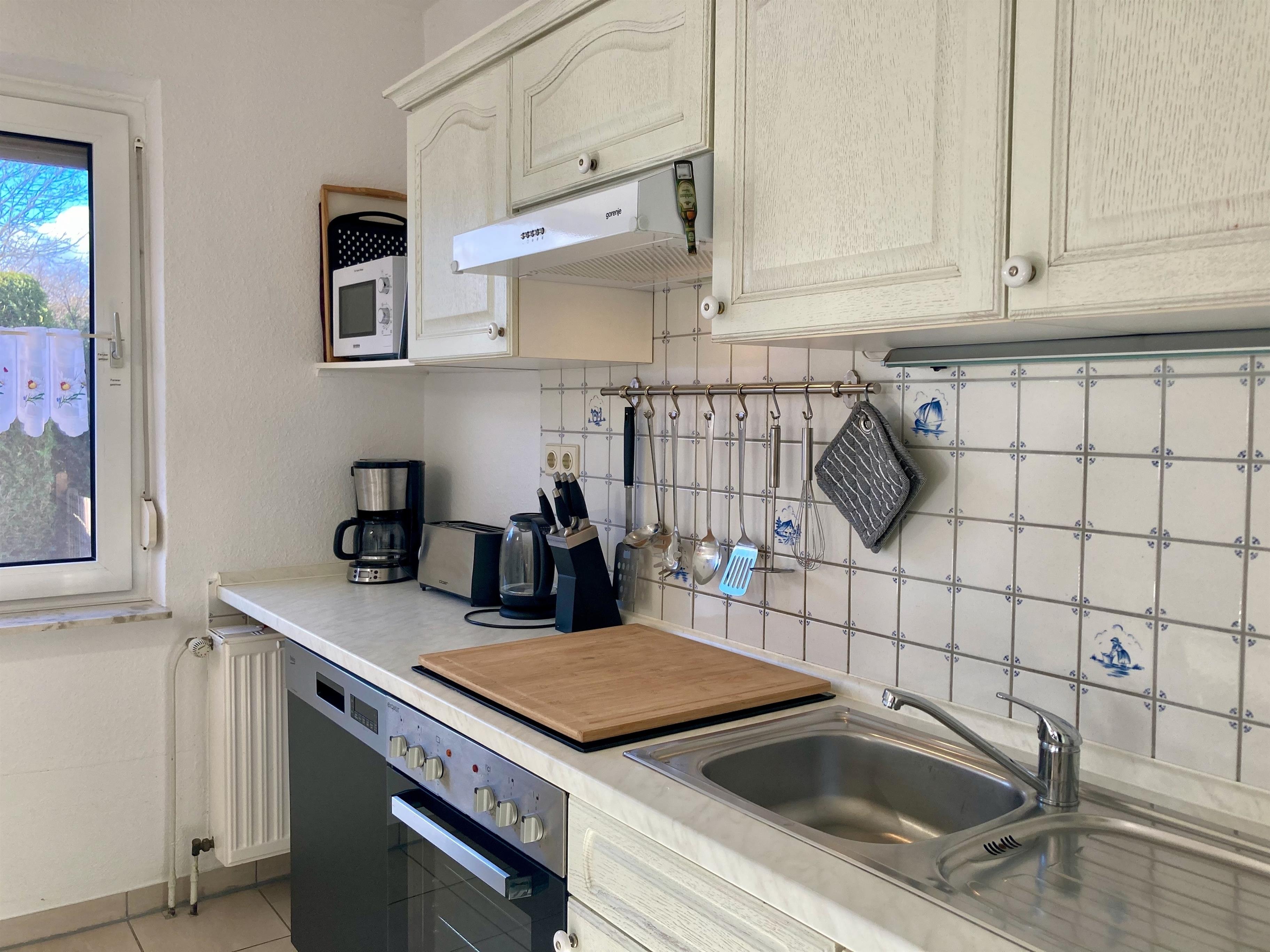 Gemütliche Einrichtung und gute Ausstattung mit überwiegend hellem Weichholzmobiliar sowie maritimen Deko-Elementen. Fliesenböden, in den Schlafbereichen Laminatfußböden. Fliegenschutzgitter in allen Räumen. Bügelbrett/-eisen. Kinderbett, Hochstuhl und mobile Kindersicherung vorhanden, Bollerwagen im Gartenhaus zur freien Nutzung. Tischfußball. Safe. Gas-Zentralheizung.