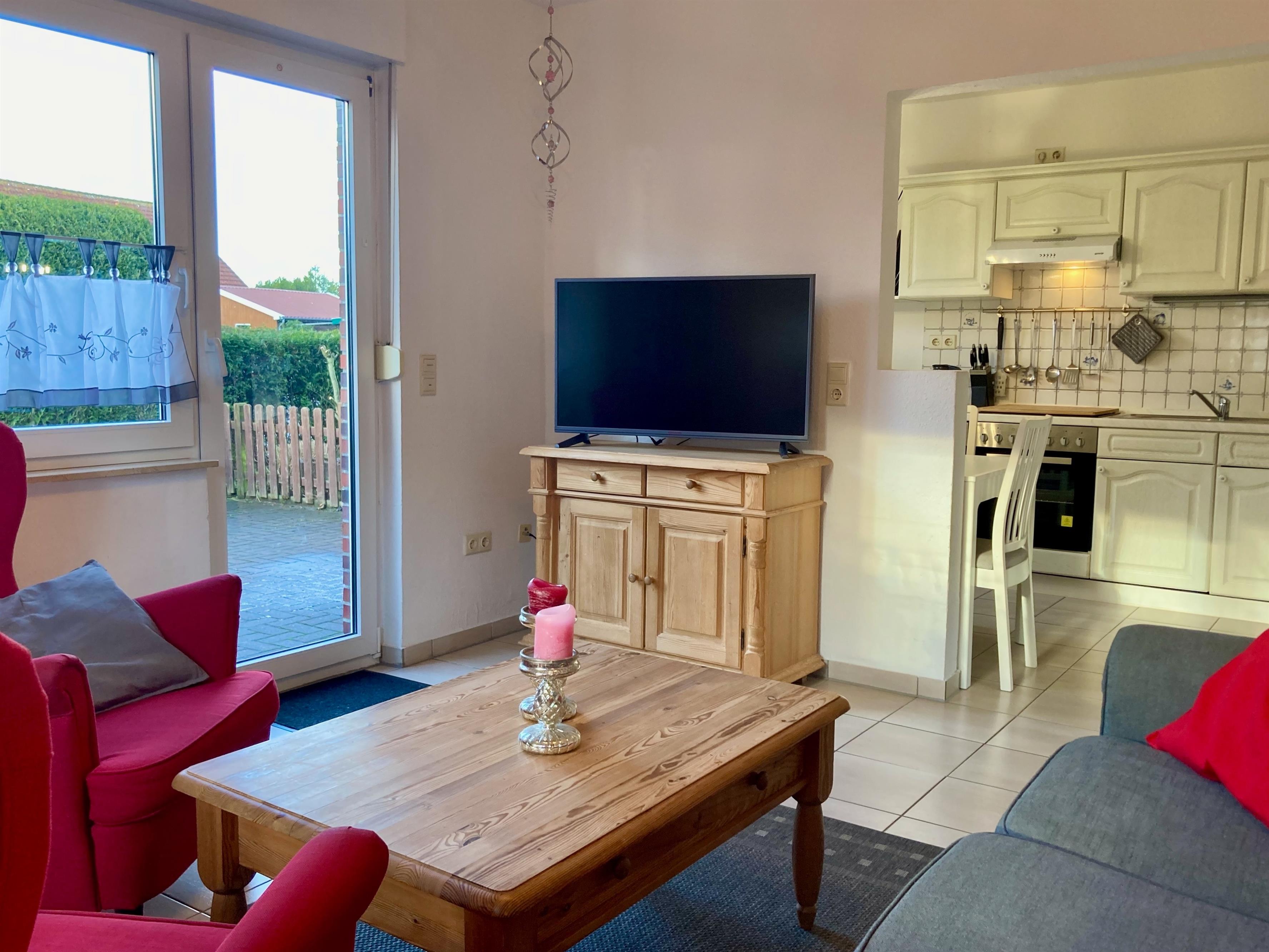 Erdgeschoss: Flur. Wohnraum mit Sitzgruppe, Sat-TV (Amazon-Fire-TV), Radio/CD, Internetzugang (wlan, gratis), Terrassenausgang. Zum Wohnraum offene Küche mit Einbauherd (4 Ceranfelder, Backofen), Geschirrspüler, Kühlschrank, Mikrowelle, Airfryer, Kaffeemaschine, Toaster, Wasserkocher sowie Essplatz (Esstisch ausziehbar). Schlafzimmer mit Boxspringbett (1,40 m x 2 m), kleine Sitzecke. Dusche/WC mit Waschmaschine. Vom Flur Treppe ins Obergeschoss (Dachschrägen): Doppelzimmer mit kleiner Sitzecke. Einzelzimmer. WC. Abstellraum.