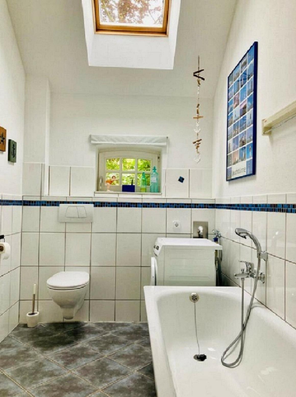 Zur Wohnung gehört ein eingezäunter Garten. Zur gemeinschaftlichen Nutzung stehen eine Sauna, eine Infrarotkabine mit Ruhemöglichkeiten und Kaltdusche (jeweils verfügbar für einen extra Beitrag) sowie ein Kicker bereit.