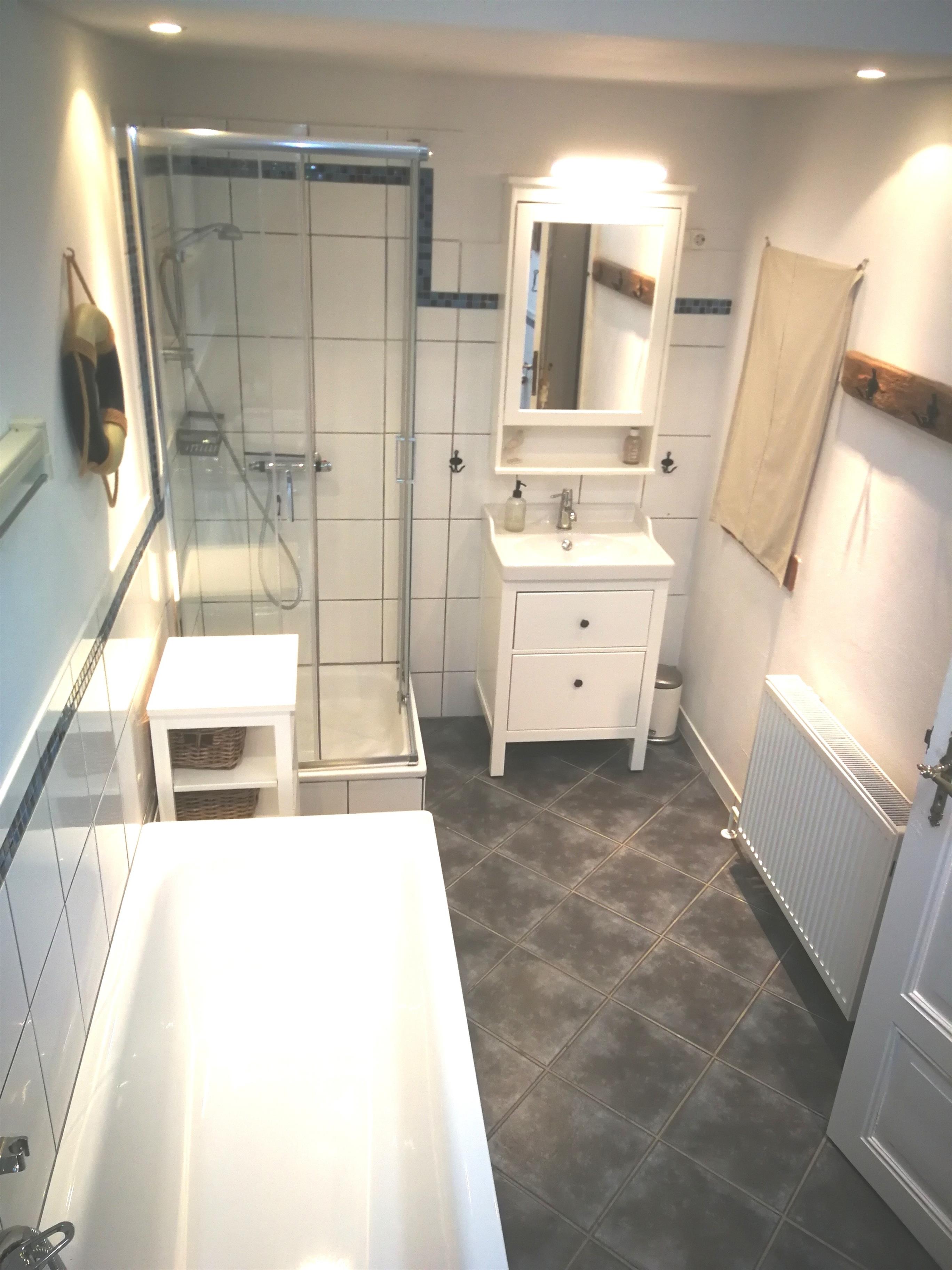 Im Erdgeschoss befinden sich das Wohnzimmer, die Küche mit Essbereich sowie ein großes Bad mit Toilette, Badewanne und Dusche. Über eine Holztreppe gelangt man ins Obergeschoss, wo sich zwei Schlafzimmer (eins mit Doppelbett, eins mit zwei Einzelbetten und einer Schlafcouch) befinden.
