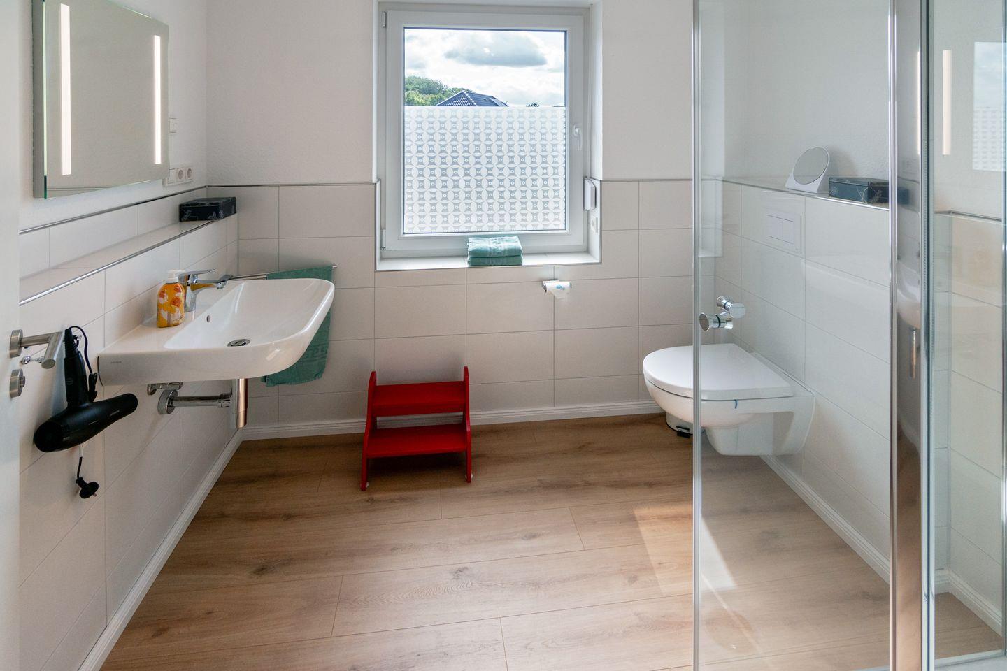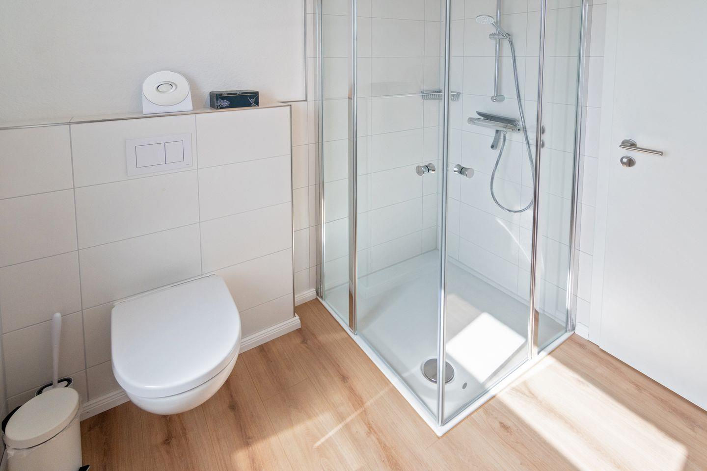 Im Obergeschoss erwartet Sie ein elegantes Schlafzimmer mit einem bequemen Boxspring-Ehebett und eigenem Fernseher sowie ein weiteres Schlafzimmer mit einem komfortablen Einzelboxspringbett und einem niedrigen Einzelbett (Länge 1,80 m, nur für Kinder geeignet). Das moderne Duschbad mit WC verspricht Wohlfühlmomente nach einem erlebnisreichen Tag.