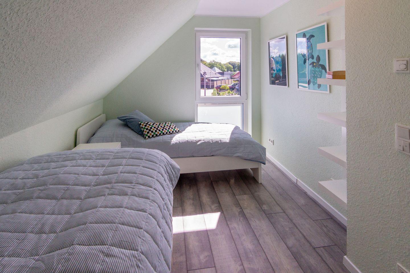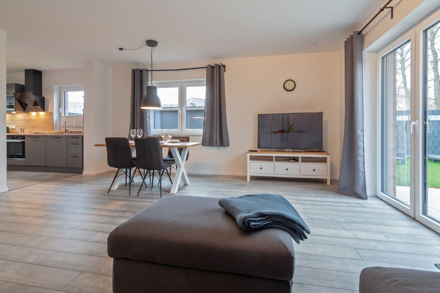 Die Wohnung bietet Ihnen eine großzügige Fläche von 85 m² und verfügt über zwei geschmackvoll eingerichtete Schlafzimmer sowie ein Badezimmer mit bodengleicher Dusche. Zusätzlich ist ein Gäste-WC vorhanden, was besonders für Gruppen angenehm ist. Die Schlafzimmer sind mit modernem Vinylboden ausgestattet und bieten Ihnen einen erholsamen Rückzugsort nach einem erlebnisreichen Tag. Das Wohnzimmer ist das Herzstück der Seeperle, ausgestattet mit einem Sofa, einem Esstisch sowie einem Smart-TV. Der lichtdurchflutete Raum öffnet sich zu einer offenen Küche, die mit hochwertigen Geräten wie einem Induktionsherd, einem Backofen, einer Mikrowelle, einer Spülmaschine und einem Kühlschrank mit Gefrierfach ausgestattet ist.