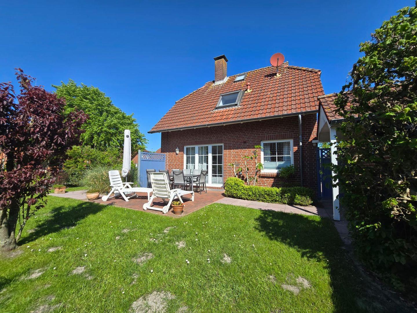 Ein besonderes Highlight dieser Ferienwohnung ist der vollständig eingezäunte Garten. Er eignet sich hervorragend für Familien mit Kindern oder Hundebesitzer, die ihrem vierbeinigen Begleiter sicheren Freiraum bieten möchten. Auf der sonnigen Terrasse genießen Sie die frische Nordseeluft, nehmen Ihr Frühstück im Freien ein oder lassen den Abend beim gemütlichen Grillen ausklingen.