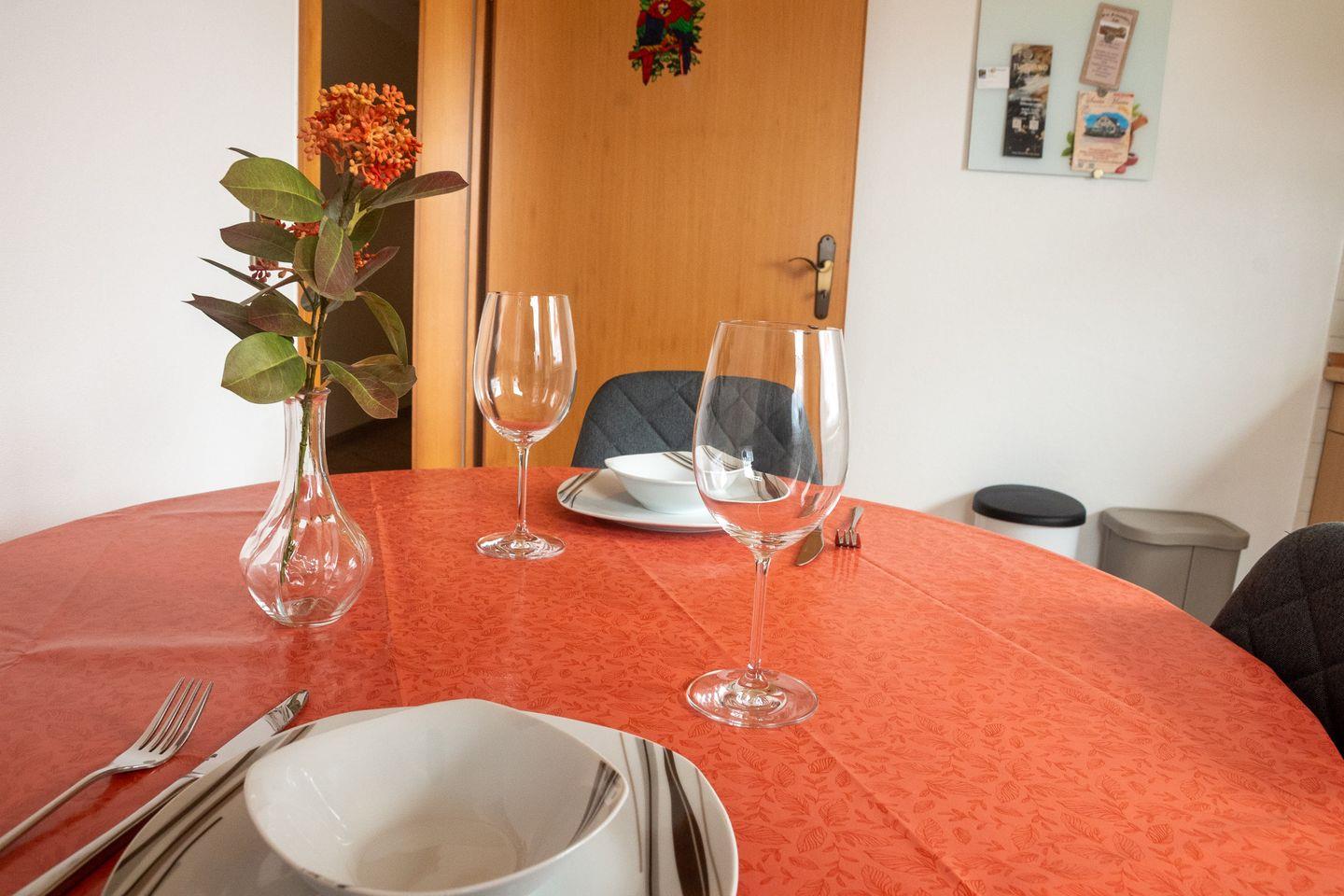 Die kleine, aber bestens ausgestattete Küche mit gemütlicher Sitzecke bietet den idealen Ort für gemeinsame Mahlzeiten. Das liebevoll eingerichtete Schlafzimmer sorgt für erholsame Nächte und süße Träume. Selbstverständlich steht Ihnen ein eigener PKW-Stellplatz zur Verfügung.