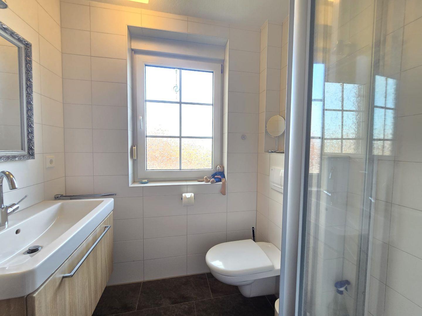Badezimmer: Im Erdgeschoss befindet sich ein frisch renoviertes Gästebad mit Fenster (Renovierung 2025), während das Obergeschoss über ein modernes Tageslichtbad mit Dusche verfügt.