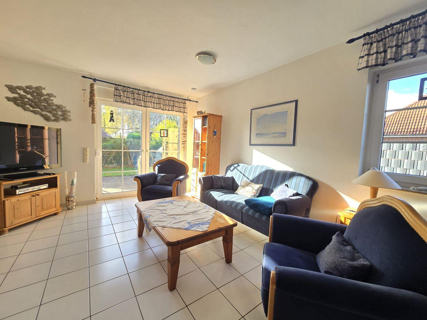 Außenbereich: Ein gepflegter Garten mit sonniger Terrasse ermöglicht entspannte Stunden im Freien. Ob Frühstück in der Morgensonne, Grillabende oder gemütliches Beisammensein – hier genießen Sie die frische Nordseeluft.