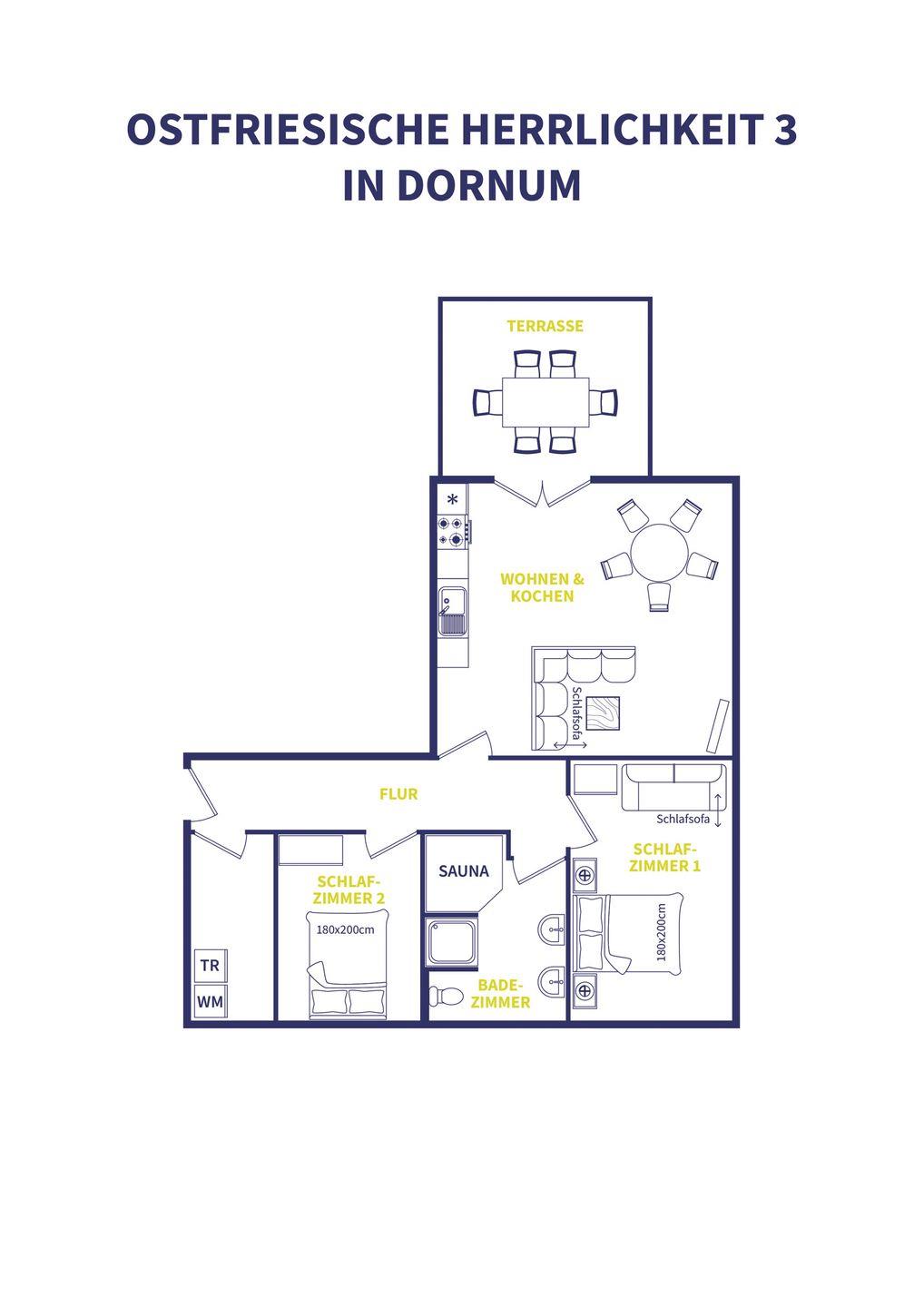 Unsere nagelneue Ferienwohnung "OSTFRIESISCHE HERRLICHKEIT" liegt in der historischen Alten Poststraße in Dornum. Wohnung 1 im Erdgeschoss, Platz für 4–6 Personen, 3 weitere Wohnungen verfügbar. Eine Sauna steht ganzjährig kostenfrei zur privaten Nutzung bereit. Im umzäunten Garten gibt es Sitzgelegenheiten und Kindereinrichtungen; Hunde dürfen frei laufen. Eigener Parkplatz direkt am Gebäude; weitere Parkplätze mit Lademöglichkeit für E-Autos vorhanden.