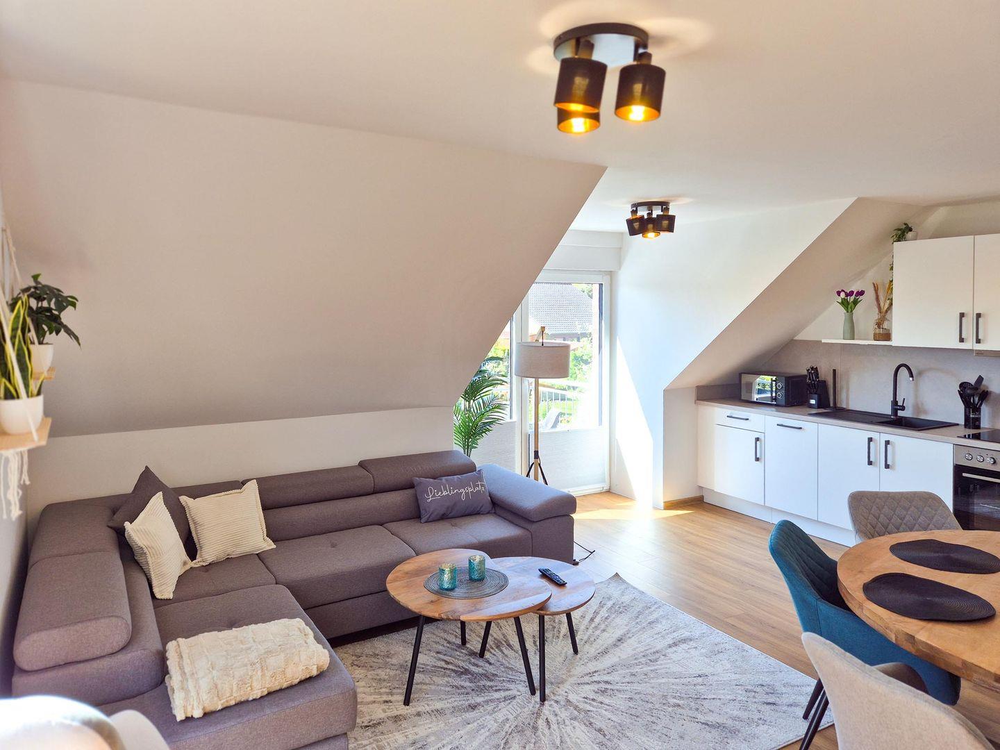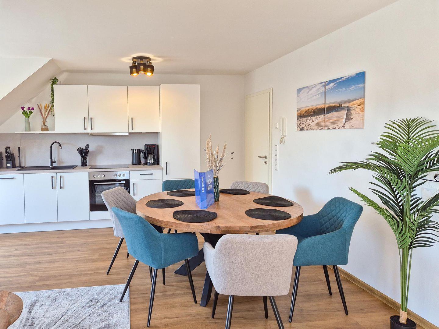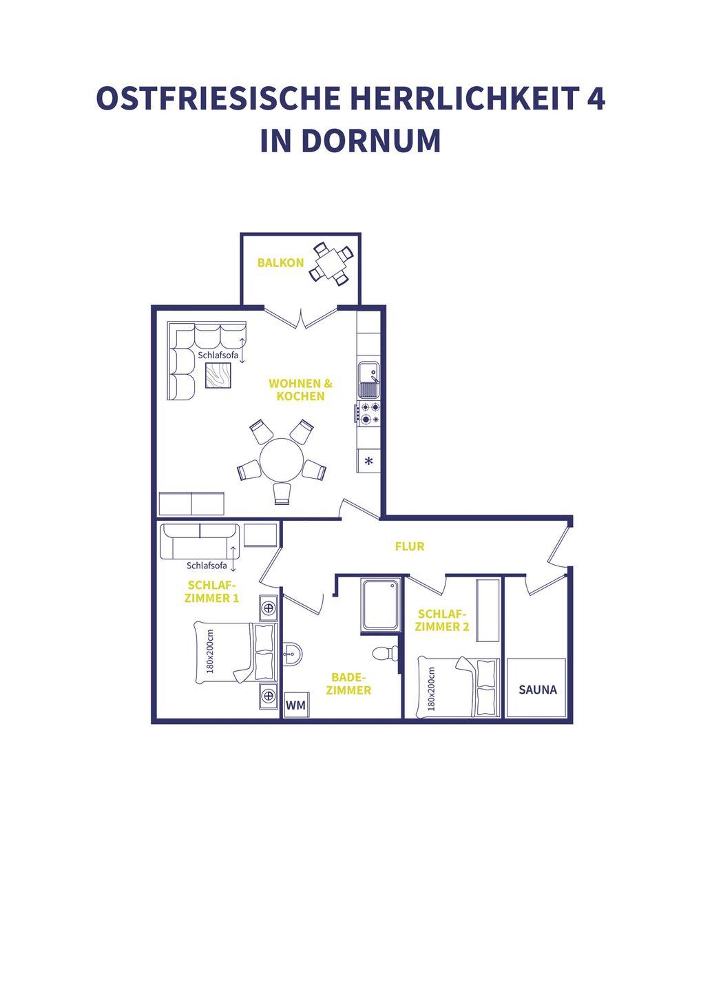 Unsere nagelneue Ferienwohnung "OSTFRIESISCHE HERRLICHKEIT" liegt in der historischen Alten Poststraße in Dornum. Wohnung 4 im Obergeschoss (Fahrstuhl vorhanden) – Platz für 4–6 Personen. Kostenlose Infrarotsauna zu jeder Jahreszeit. Zentrale Lage: nächstes Restaurant in 1 Gehminute, Bäcker, Supermarkt direkt um die Ecke. 3 Gehminuten zum barocken Wasserschloss aus dem 14. Jh. Eigenes Parkplatz direkt am Gebäude; weitere Parkplätze mit Lademöglichkeit für E-Autos vorhanden.