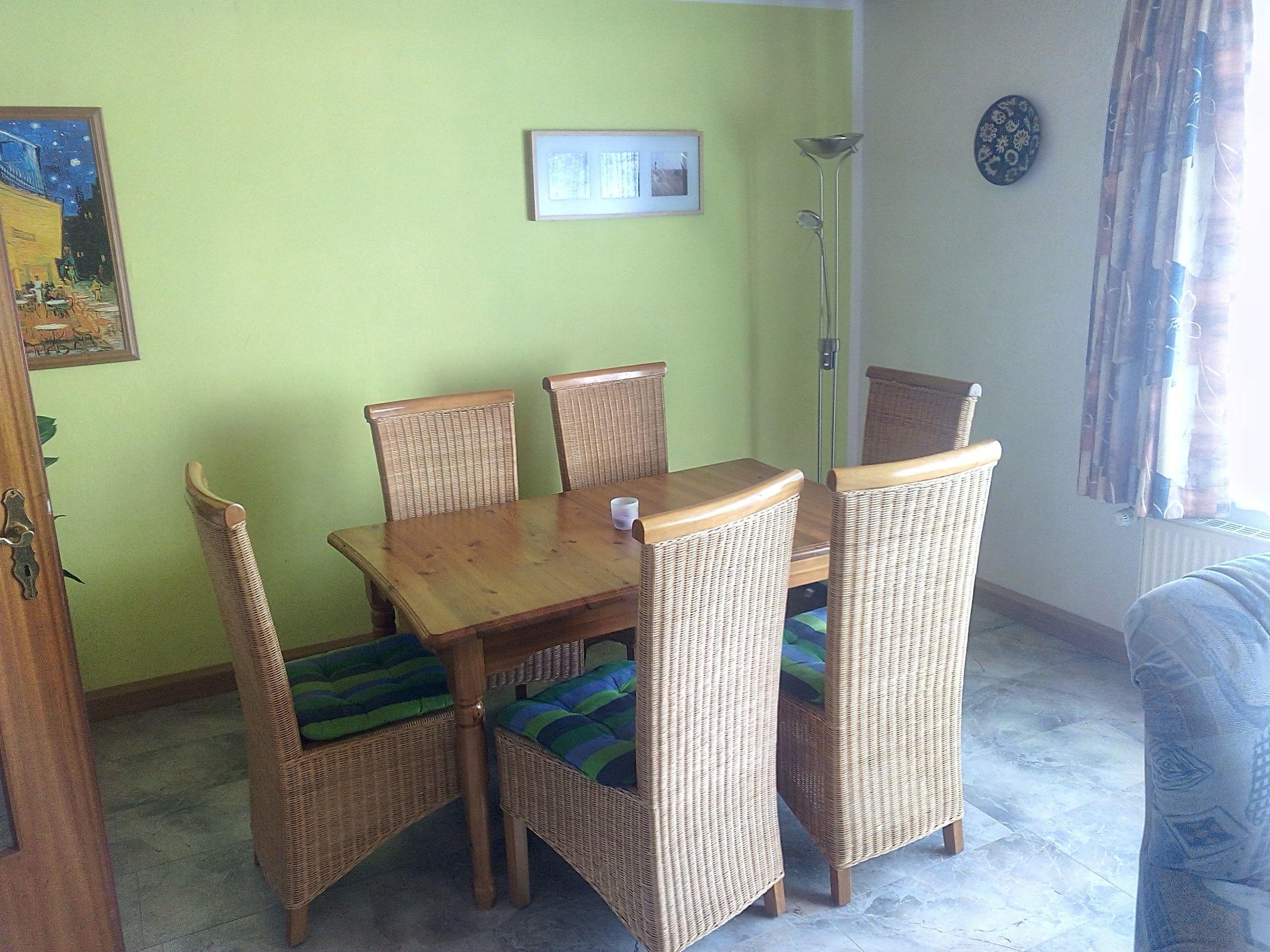 Unsere Wohnung "Spiekeroog" ist komplett für 6 Personen eingerichtet (zusätzlich steht ein Babybett und ein Hochstuhl zur Verfügung). Es ist eine komplette Küche mit Geschirrspüler, Kühlschrank, Backofen, Mikrowelle, Kaffeemaschine, Toaster, Eierkocher und weiterem Inventar vorhanden. Auch ein Wohn- / Esszimmer mit Fernseher sowie Radio/CD steht Ihnen zur Verfügung.