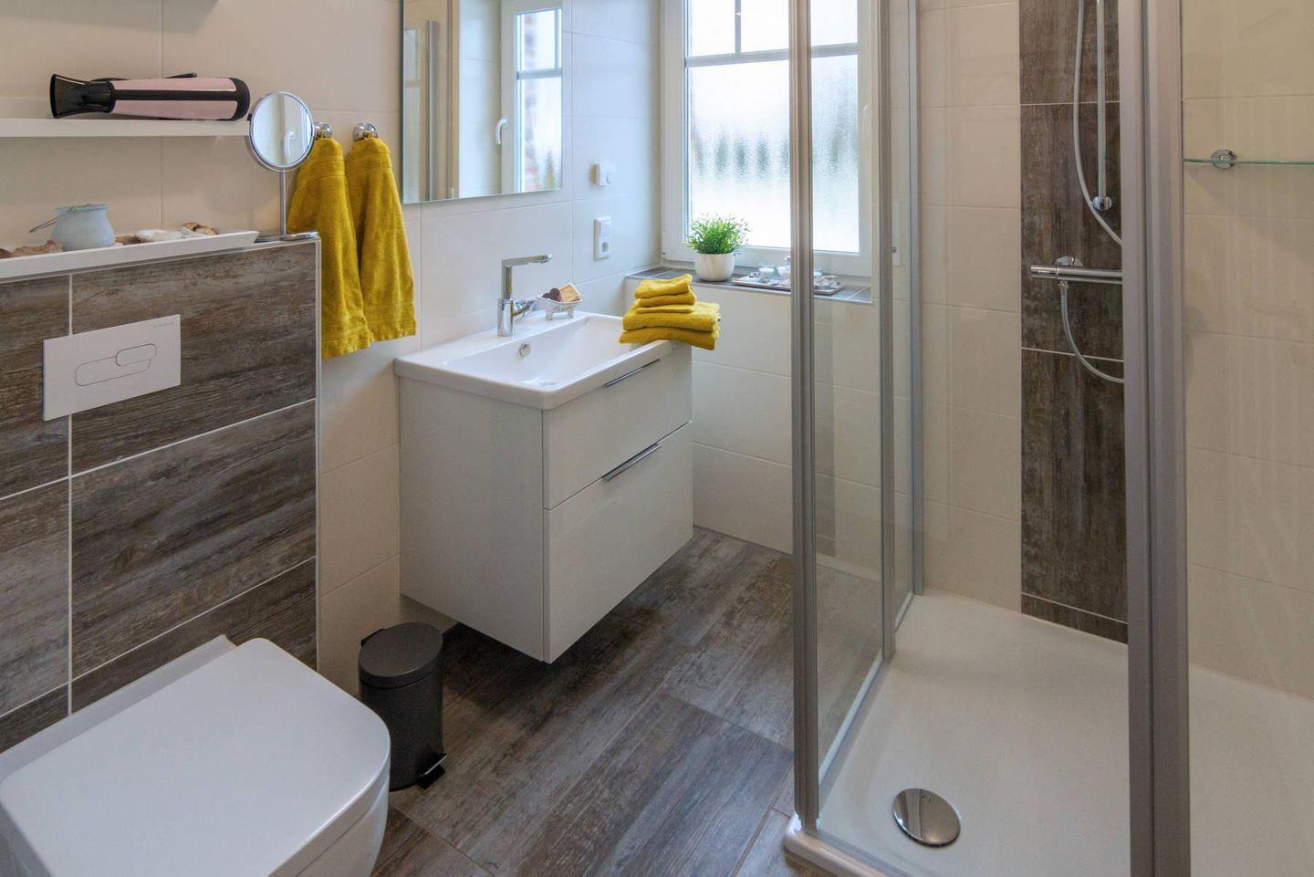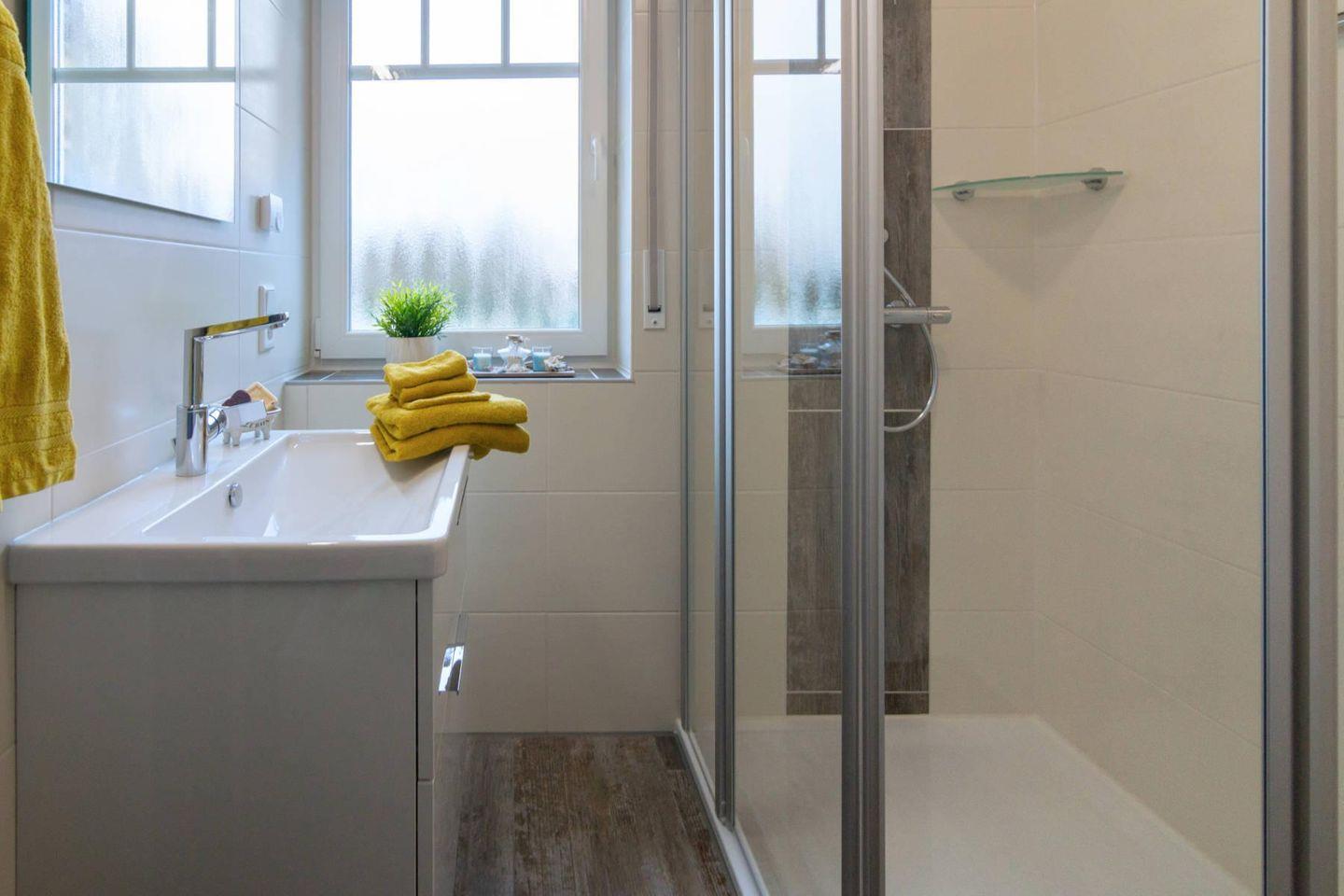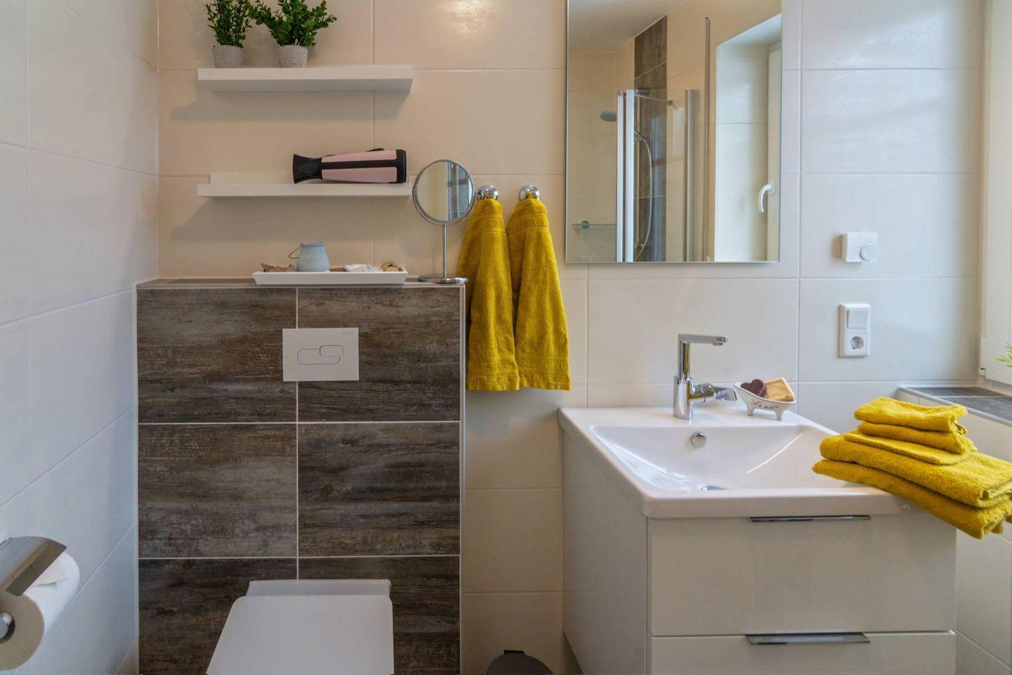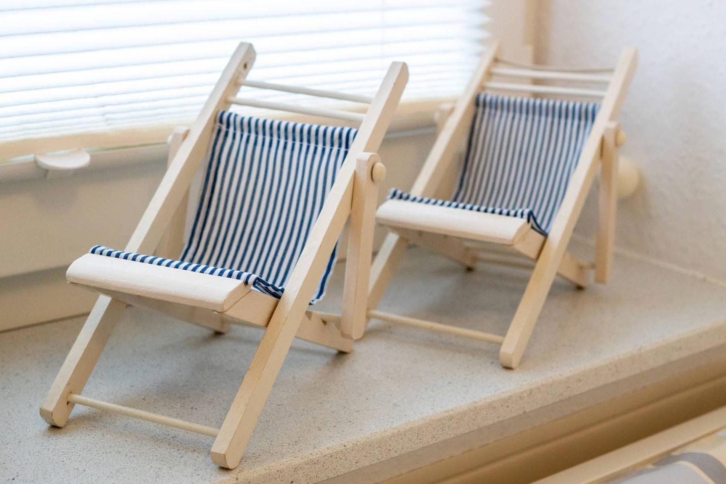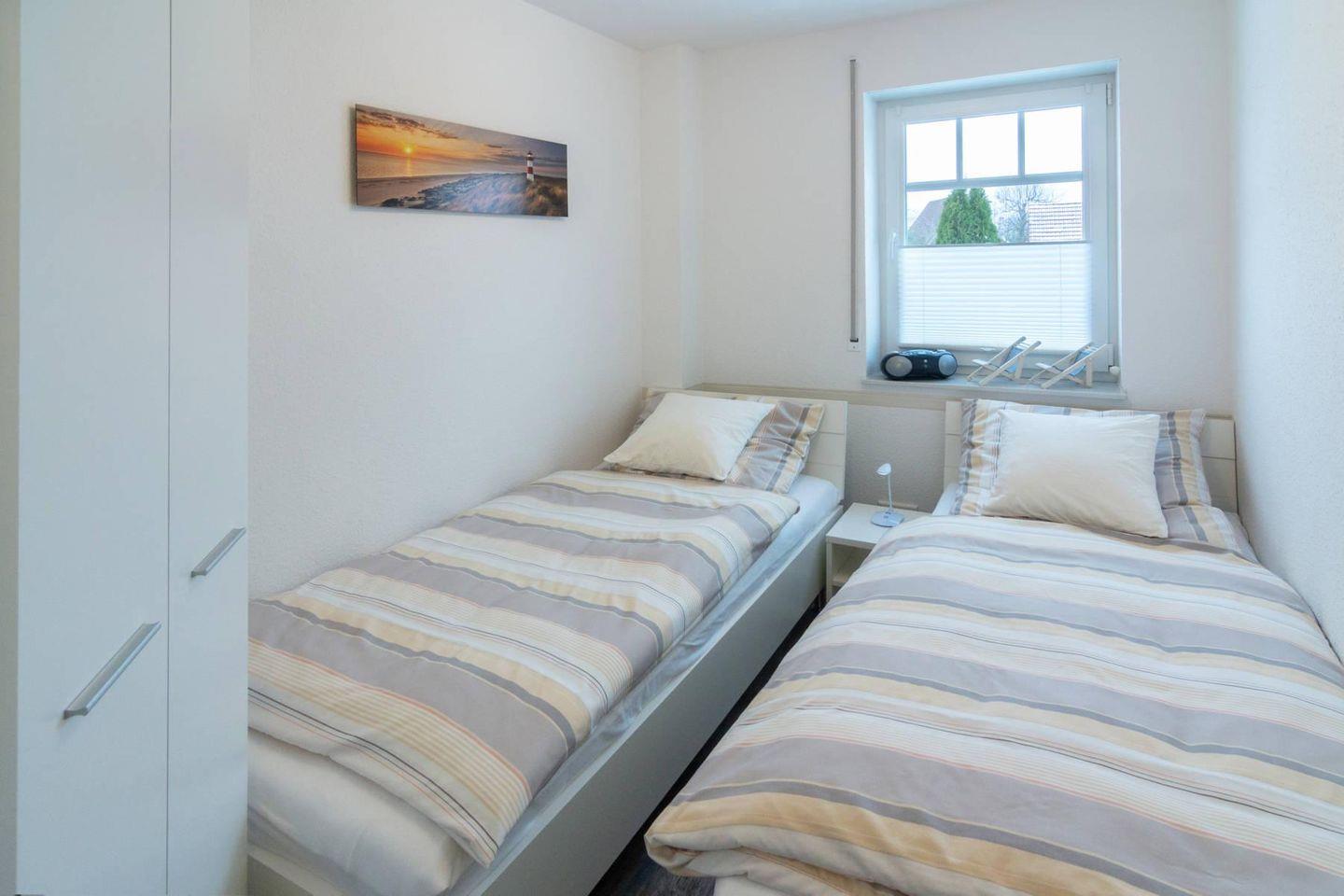Die Wohnung umfasst drei Zimmer, darunter zwei separate Schlafzimmer – eines mit elektrischem Boxspringbett, das andere mit zwei Einzelbetten (1,90 x 0,80 m, auch zusammenstellbar, mit Bettrausfallschutz). Zudem gibt es ein Duschbad mit WC und einen Abstellraum. Kinder und Babys sind willkommen, ein Hochstuhl ist vorhanden.