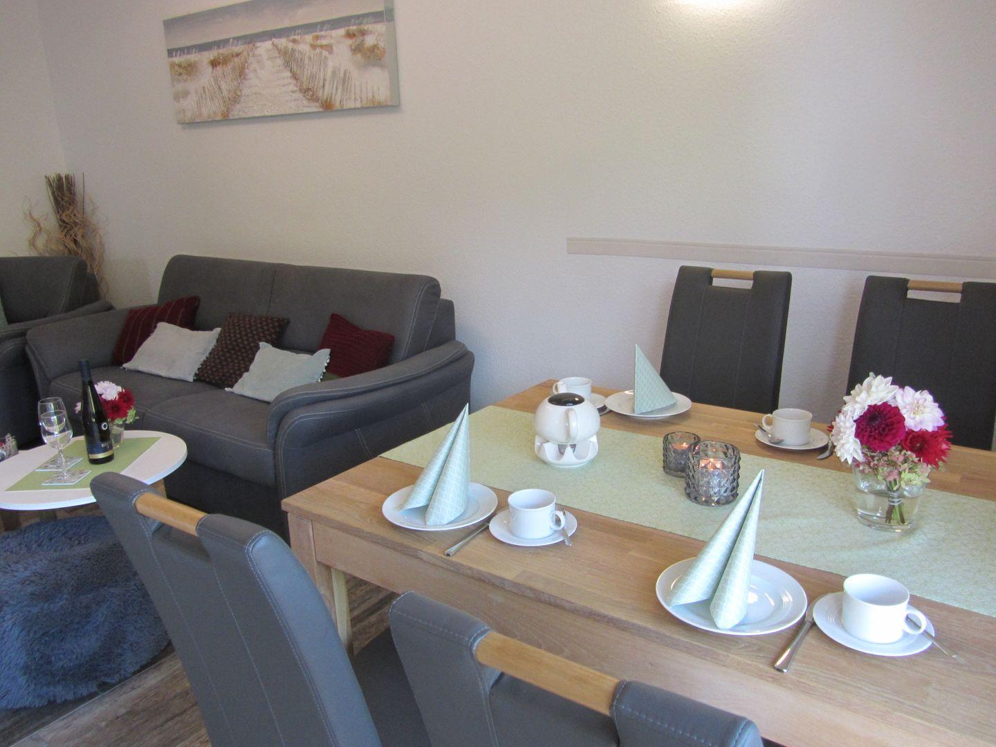 Die offene Küche ist komplett ausgestattet mit Spülmaschine, Kühlschrank mit Gefrierfach, Backofen, 4-Platten-Herd, Mikrowelle, Kaffeemaschine, Dolce-Gusto-Maschine, Toaster, Wasserkocher, Eierkocher und allen nötigen Küchenutensilien. Der Essbereich bietet Platz für gemeinsame Mahlzeiten.