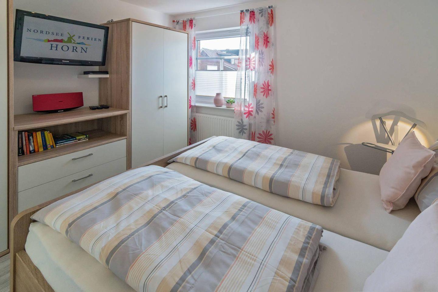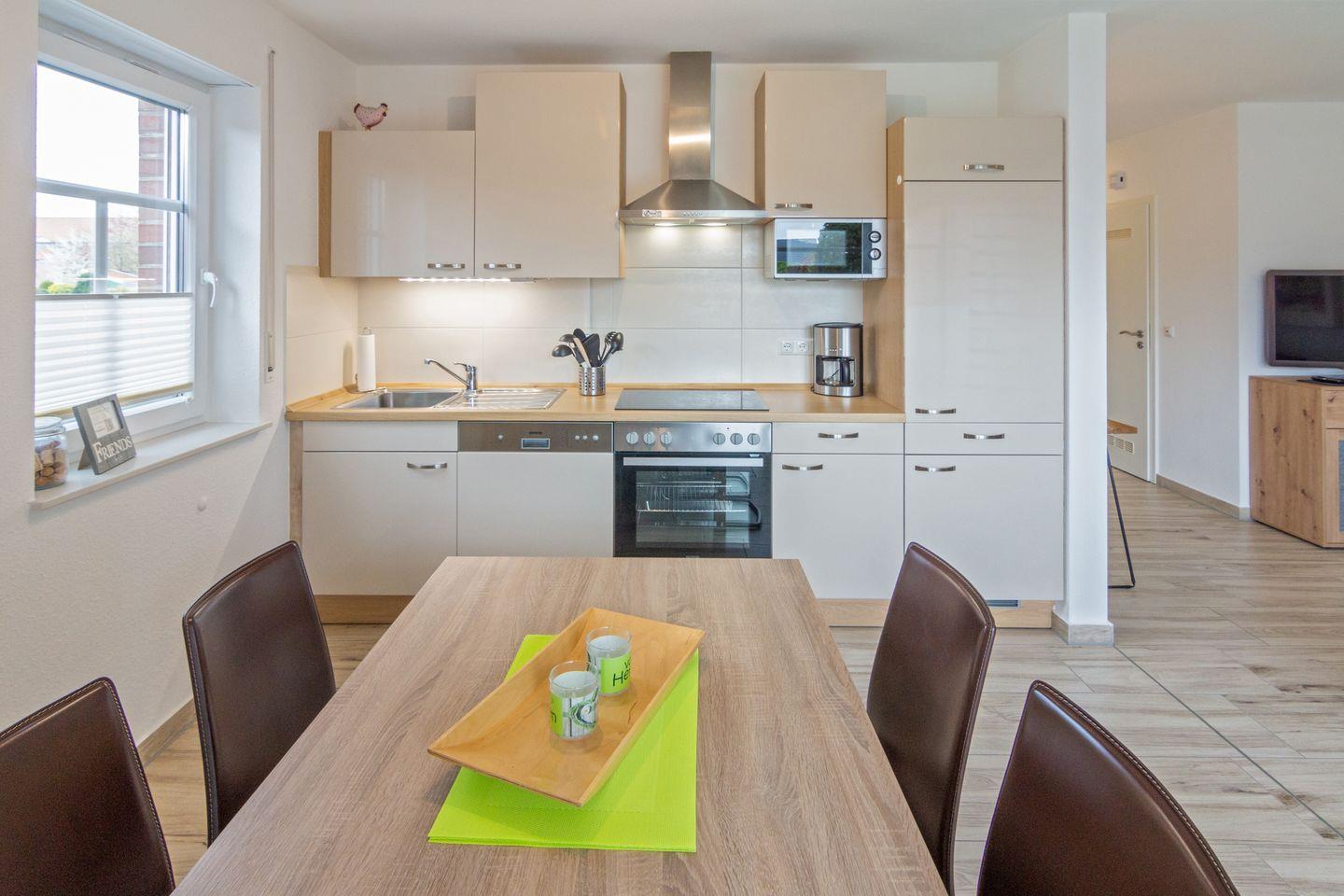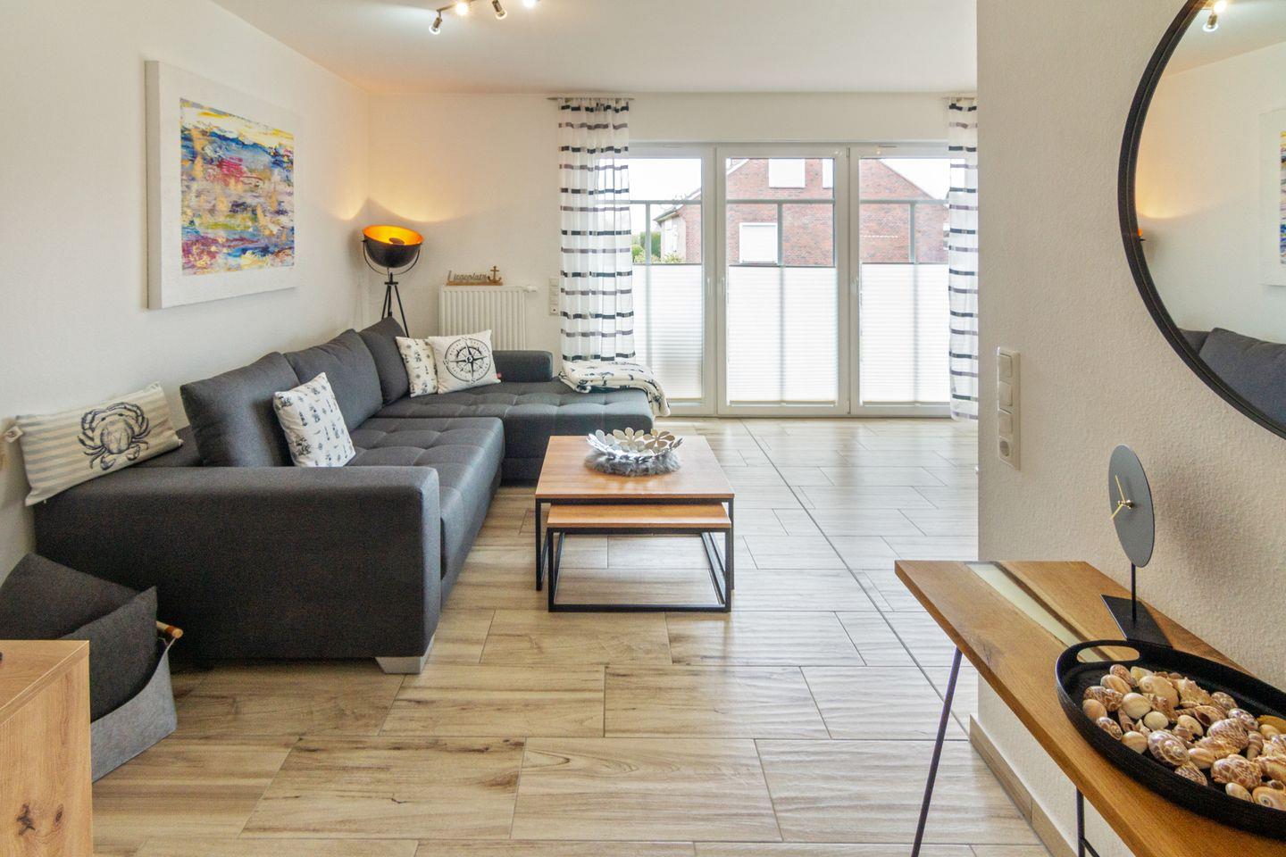 Moderne Erdgeschosswohnung für 2 Personen und ein Kleinkind in einem 4-Parteien-Haus im Küstenbadeort Dornumersiel in unmittelbarer Nähe vom Deich. Die Wohnung befindet sich in zentraler Lage in einem ruhigen Ferienhauswohngebiet. Ein Supermarkt mit Bäckerei (auch Sonntags und an Feiertagen geöffnet) ist fußläufig erreichbar. Geschäfte, Restaurants, Pizzeria, Eisdiele und Fahrradverleih sind ebenfalls in direkter unmittelbarer Nähe, Strand und Hafen erreichen Sie in wenigen Gehminuten.