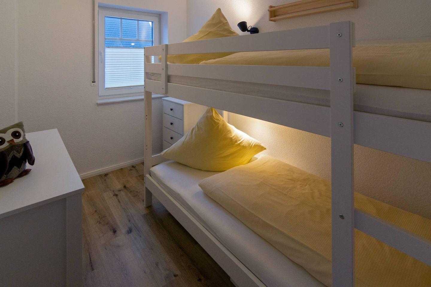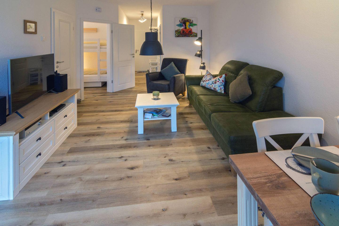 Die Ferienwohnung verfügt über einen großen Wohn- und Essbereich mit angrenzender voll ausgestatteter Küche, zwei Schlafzimmer (eines mit Boxspringbett 1,60 x 2 m, eines mit Etagenbett), ein ebenerdiges Duschbad mit WC und einen Abstellraum für Ihre Fahrräder. Zur Wohnung gehört eine gemütliche Terrasse. Vor dem Haus befindet Ihr PKW-Stellplatz. Das WLAN steht Ihnen kostenfrei zur Verfügung. Obwohl Haustiere nicht erlaubt sind, ist die Wohnung nicht geeignet für Allergiker.