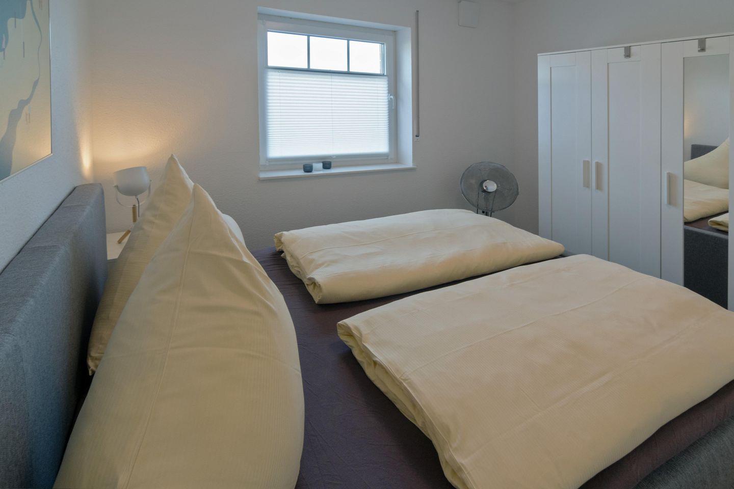 Das Herzstück ist der helle Wohnbereich mit gemütlicher Sofaecke, Essplatz und offener, voll ausgestatteter Küche. Ceranherd, Backofen, Spülmaschine, Kühlschrank mit Gefrierfach, Kaffeemaschine, Wasserkocher und reichlich Küchenutensilien lassen keine Wünsche offen. Zwei separate Schlafzimmer – eines mit komfortablem Boxspringbett, das andere mit zwei stapelbaren Futonbetten – sorgen für erholsamen Schlaf. Ein Babybett und Hochstuhl sind vorhanden. Das moderne Tageslichtbad mit Dusche, WC, Waschbecken und Haartrockner ergänzt die hochwertige Ausstattung. Für zusätzlichen Komfort stehen Waschmaschine, Staubsauger, Bügeleisen und Fußbodenheizung bereit.