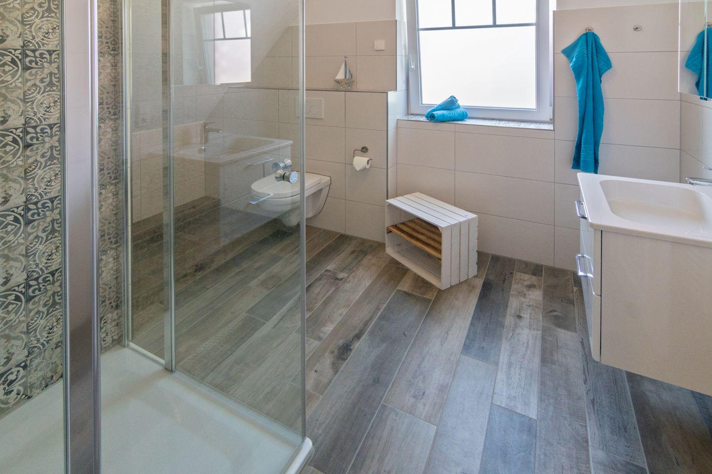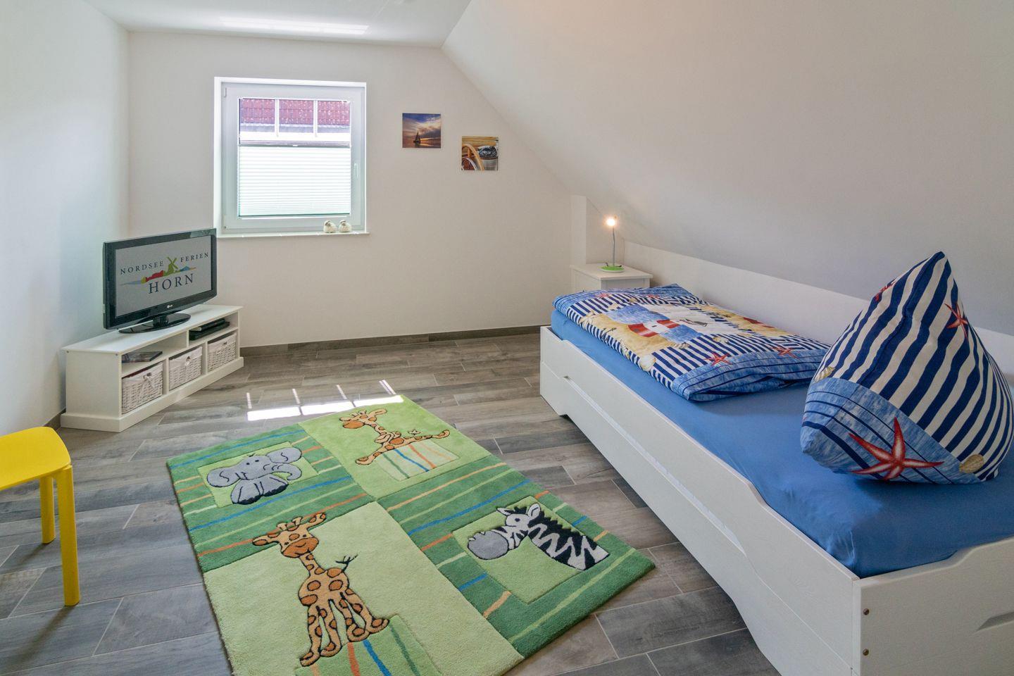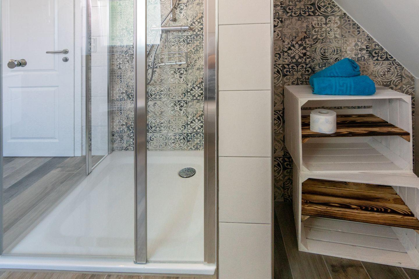 Das Obergeschoss verfügt über zwei liebevoll eingerichtete Schlafzimmer – eines mit Ehebett, das andere mit zwei stapelbaren Einzelbetten (niedrige Höhe), beide ausgestattet mit einem TV – sowie ein modernes Duschbad mit WC.